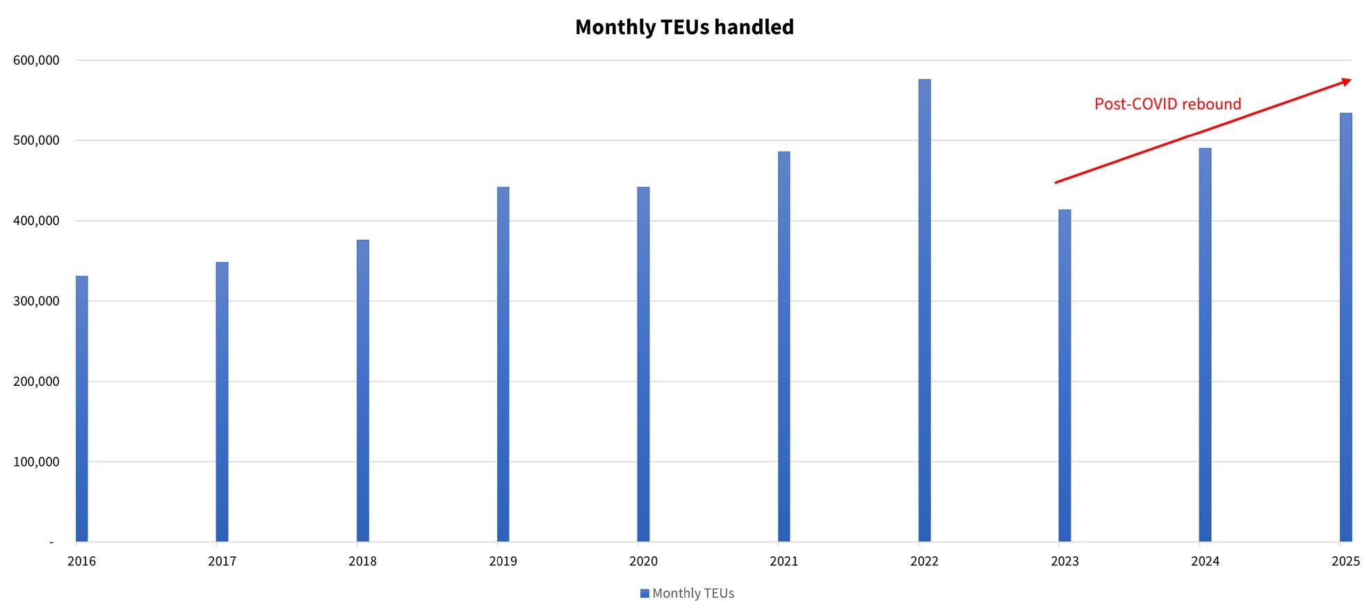 » The Port handled 500,900 TEUs in May 2025, marking the third consecutive month exceeding the half-million TEU threshold (first time in Port history)