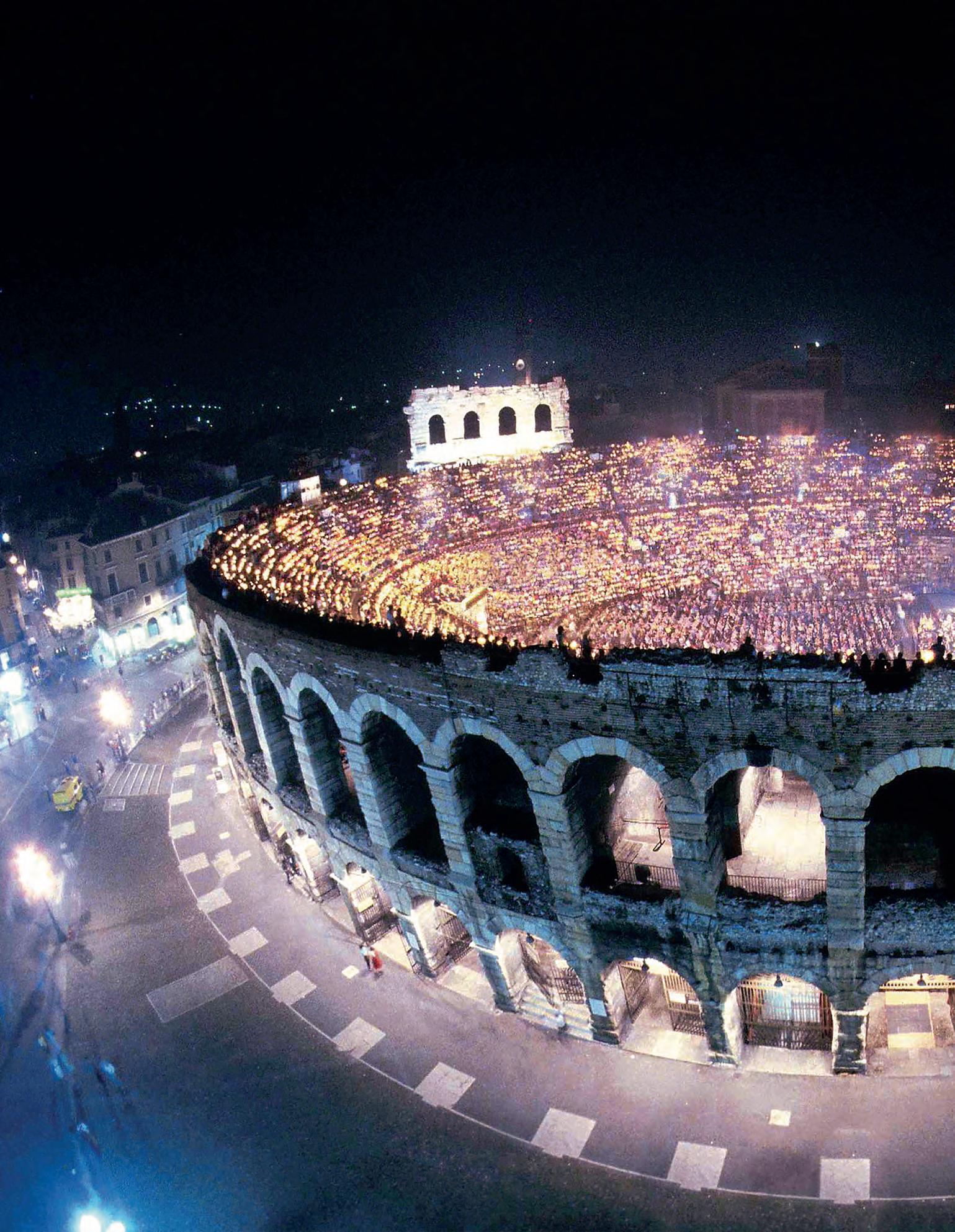 Il monumento più famoso di Verona, l’Arena è uno dei più grandi anfiteatri d’Italia. Di forma ellittica, fu costruito dai Romani (I sec. d.C.) all’esterno delle mura della città, realizzato in calcare della Valpolicella; poteva accogliere circa 30 mila spettatori per vari tipi di spettacoli dai combattimenti tra gladiatori e cacce ad animali feroci ed esotici. Rappresenta uno degli esempi più prestigiosi dell’ingegneria romana. Esisteva un anello esterno originale, di cui attualmente resta soltanto l’”Ala” su cui c’erano le indicazioni numeriche per l’ingresso ordinato degli spettatori. L’Arena nei secoli ha continuato ad ospitare spettacoli ed ancora oggi è famoso in tutto il mondo per l’Arena di Verona Opera Festival.
