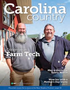 16 Music in the Mountains Support local organizations at the Bear Shadow Festival. 8 (ISSN 0008-6746) (USPS 832800) Volume 56, No. 5 Published monthly by 3400 Sumner Blvd., Raleigh, NC 27616-2950 Scott Gates, CCC Editor Warren Kessler Creative Director Renee C. Gannon, CCC Senior Associate Editor Rue Reynold Editorial Assistant Jessica Armstrong Graphic Designer Tara Verna Creative Services Associate Donna Natosi Digital Strategist Keith Alexander Advertising Keith@carolinacountry.com Joseph P. Brannan Executive Vice President & CEO Nelle Hotchkiss Senior Vice President & COO Kristie Aldridge, CCC Vice President North Carolina’s electric cooperatives provide reliable, safe and affordable electric service to 1 million homes and businesses. The 26 electric cooperatives are each member-owned, notfor-profit and overseen by a board of directors elected by the membership. Why Do We Send You Carolina Country Magazine? Your cooperative sends you Carolina Country as a convenient, economical way to share with its members information about services, director elections, meetings and management decisions. The magazine also carries legal notices that otherwise would be published in other media at greater cost. Your co-op’s board of directors authorizes a subscription to Carolina Country on behalf of the membership at a cost of less than $5 per year. Subscriptions: Individual subscriptions, $12 per year. Schools, libraries, $6. Carolina Country