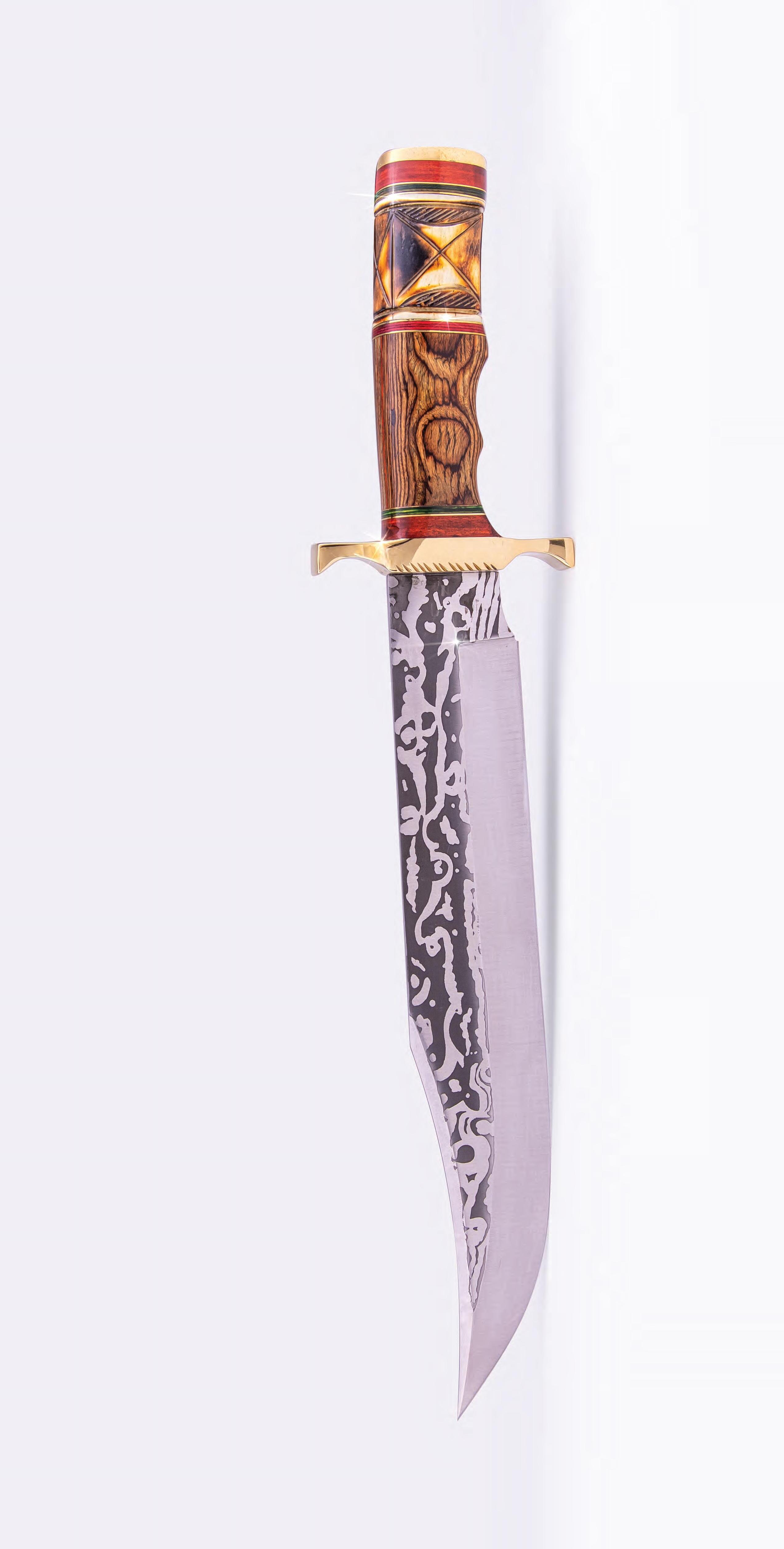 • Etched stainless steel full tang blade ; 16” overall • Painted natural bone and wood handle • Brass hand guards, spacers & end cap • Includes genuine tooled leather sheath 14101 Southcross Drive W., Ste 155, Dept. DUK402-01 Burnsville, Minnesota 55337 www.stauer.com