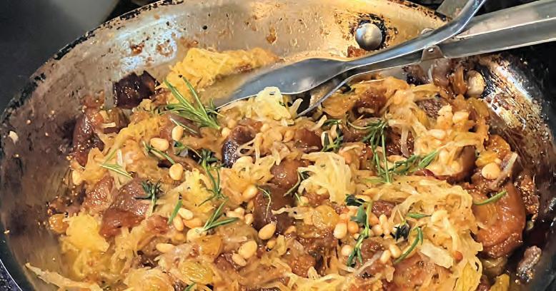 Cut squash in half lengthwise and remove seeds. Brush with oil and dust with salt and pepper. Roast, cut side down, at 400 degrees for 35–40 minutes. Cool, then scrape into strands with a fork.