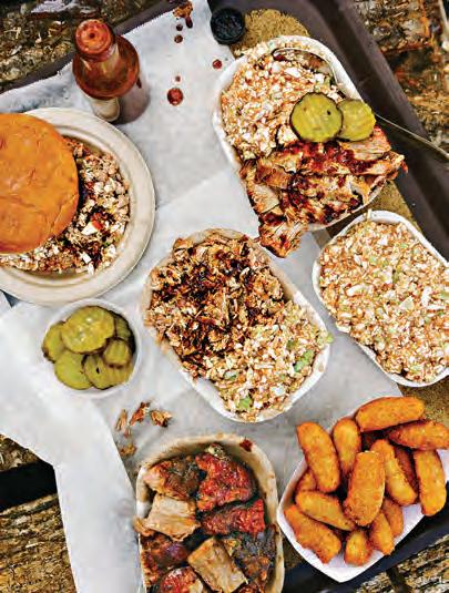Sam Jones in the pit at Sam Jones BBQ in Winterville. Sam partnered with friend and former Skylight Inn employee Michael Letchworth to open their own business in 2015, later expanding to a second location in Raleigh. Learn more about NC barbecue traditions on page 8. Photo courtesy of VisitNC.com.