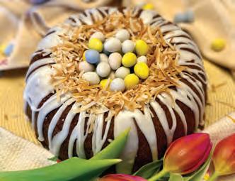 For the icing, whisk the powdered sugar and lemon juice until smooth and barely thin enough to drizzle. Press the coconut around the cake’s cavity in a nest-like shape. Fill with mini eggs.