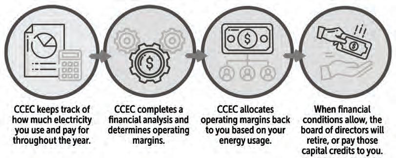 retirements from the years 1999-2024. Active CCEC members saw a credit on their September bill, while former members received a check. Since 1997, the cooperative has retired more than $56 million in capital credits to our members. Capital credits are a big part of what makes co-ops different from investor-owned utilities. We’re not here to make a profit—we’re here to serve you, our members.