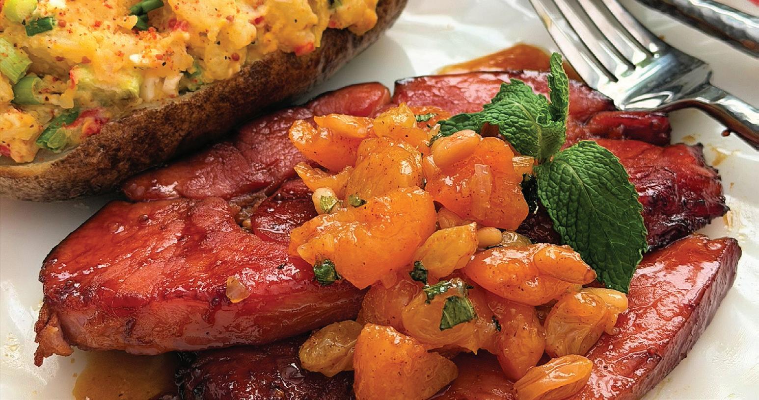 Heat butter over medium heat until sizzling. Sear steak on each side 2–3 minutes. Remove ham, lower heat and whisk in remaining ingredients. Add steak and glaze on each side for about 2 minutes. For chutney, in a saucepan, combine juice through garlic. Bring to a slow simmer over medium heat. Add fruits and spices. Continue cooking over medium-low heat for 25–30 minutes, stirring every few minutes. Remove from heat when apricots are tender. Stir in nuts, vanilla and mint. Serve over ham.