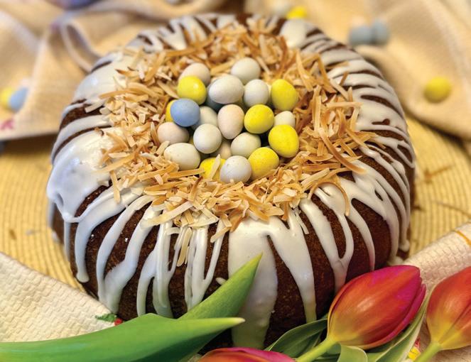 For the icing, whisk the powdered sugar and lemon juice until smooth and barely thin enough to drizzle. Press the coconut around the cake’s cavity in a nest-like shape. Fill with mini eggs.