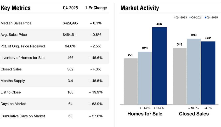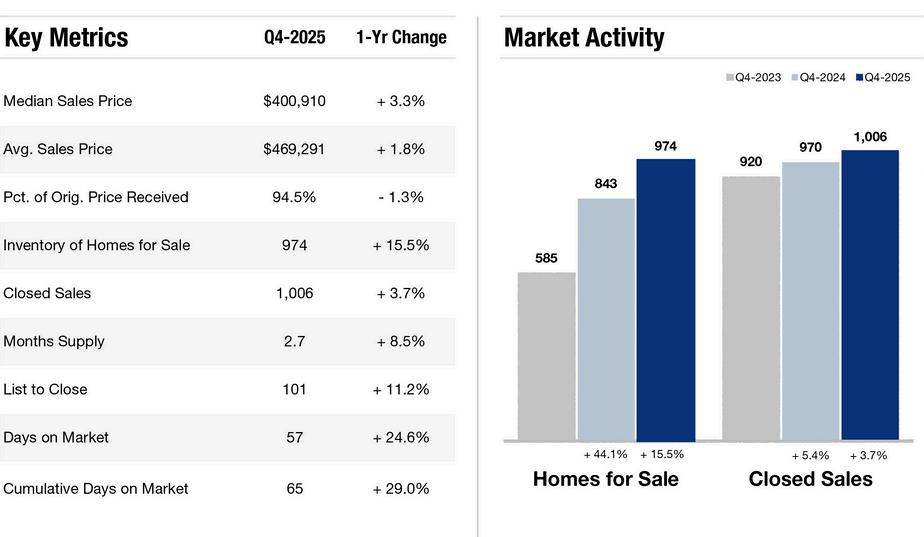 Durham closed Q4 with active demand alongside a significant rise in inventory, which increased more than 55% year over year. Closed sales dipped slightly, while homes took a bit longer to sell, signaling a shift toward balance Buyers are moving more thoughtfully, while sellers continue to benefit from sustained interest in this competitive market
