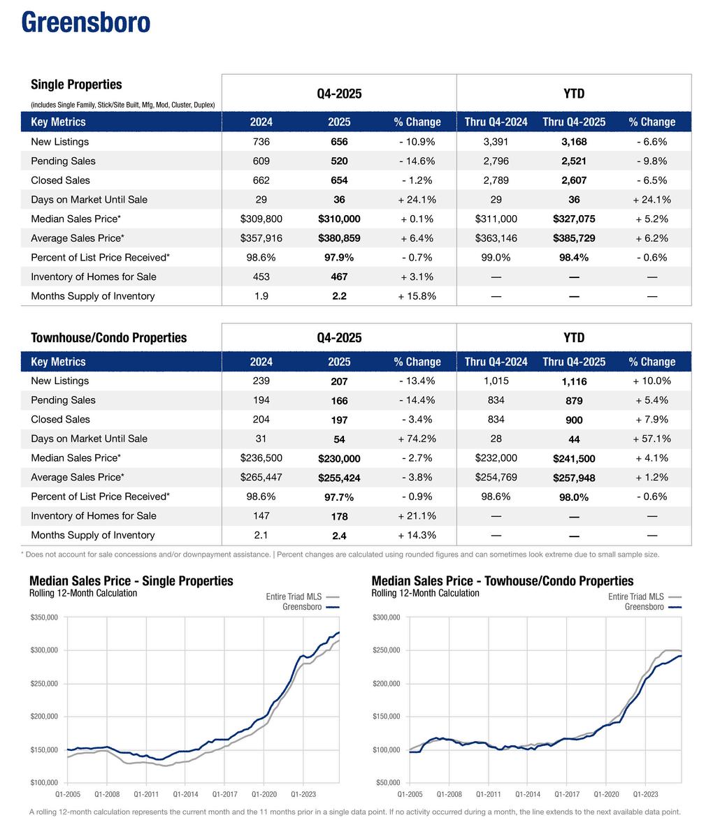 The Triad closed Q4 with continued strength, driven by affordability and steady demand. Winston-Salem posted solid year-over-year price gains, with median and average sales prices rising across property types Inventory increased, offering more choice, while closed sales held firm reinforcing the Triad’s appeal as a value-driven North Carolina market