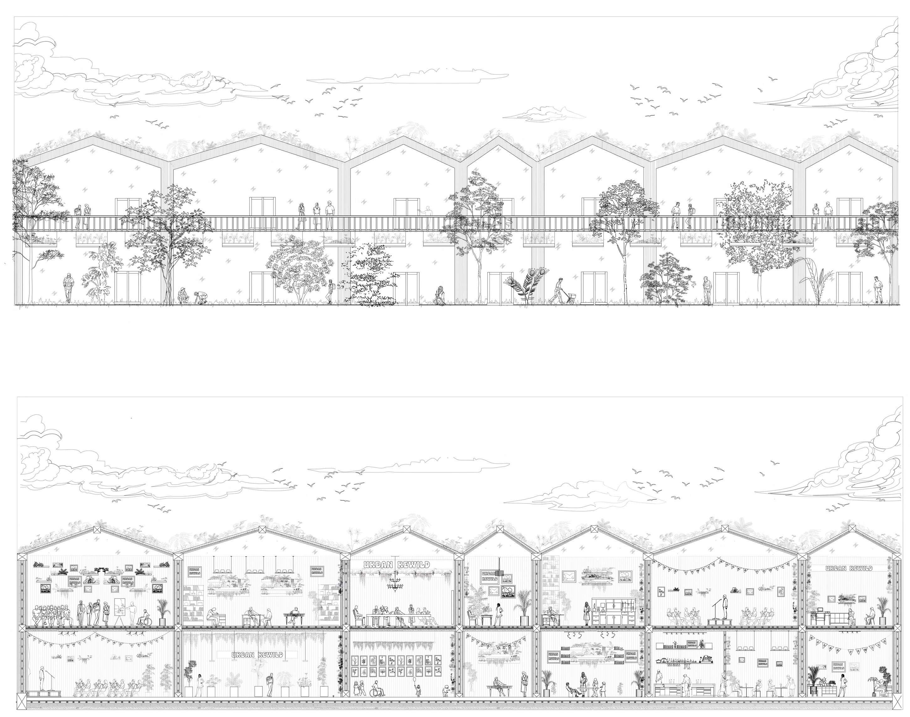 The building combines public engagement with ecological purpose. Ground-floor amenities, a café, music studio, indoor cinema, and more, encourage creativity, connection, and leisure, while the upper floor is home to Trust for Urban Ecology (TRUE), an organization dedicated to urban rewilding and community-led habitat restoration. By integrating ecology, culture, and civic life, this design transforms a once-empty space into a vibrant ecological and social center, demonstrating how thoughtful a rchitecture can regenerate urban areas, reconnect people with nature, and foster resilient, biodiverse communities.