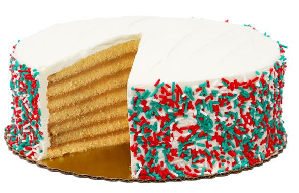 Our best-selling Caramel cake—a seven-layer stack of fluffy yellow cake with our famous caramel icing filling—gets an elegant Christmas makeover, donning a topcoat of snowwhite vanilla buttercream and a festive smattering of red, green and white sprinkles.