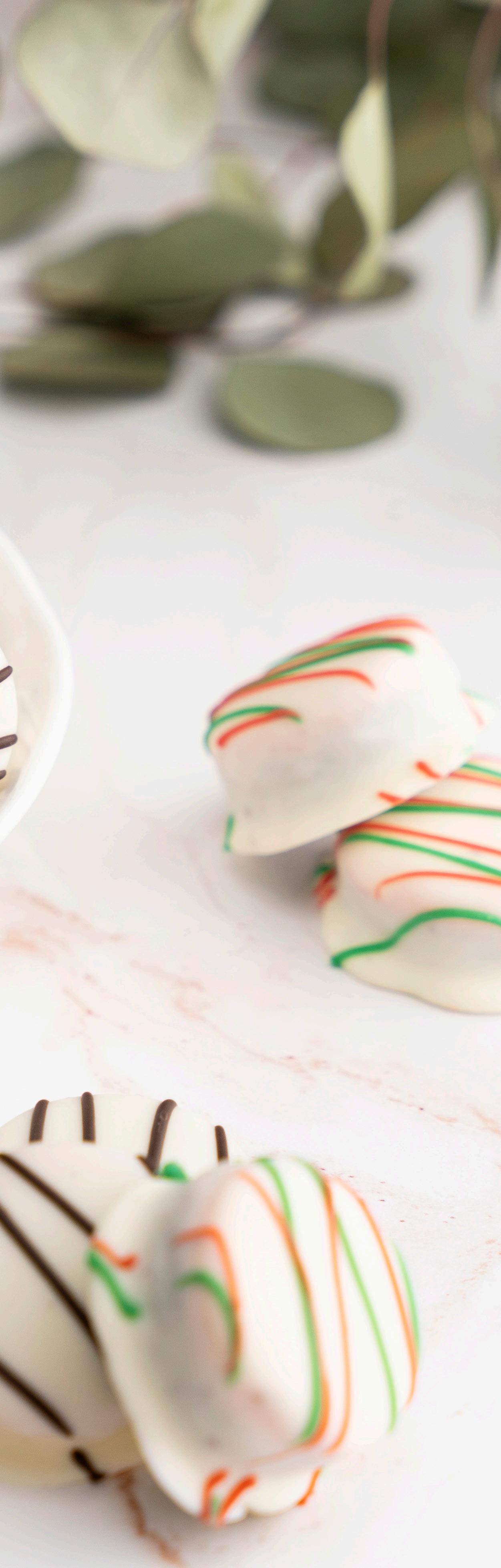 A bite-sized taste of the holidays, these silver dollarshaped discs of decadent chocolate cake are studded with crushed peppermint candies and topped with a layer of peppermint buttercream before they're dipped in white chocolate and drizzled with red and green chocolate for a festive finishing touch.