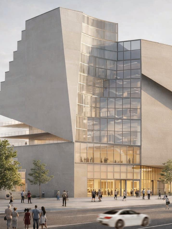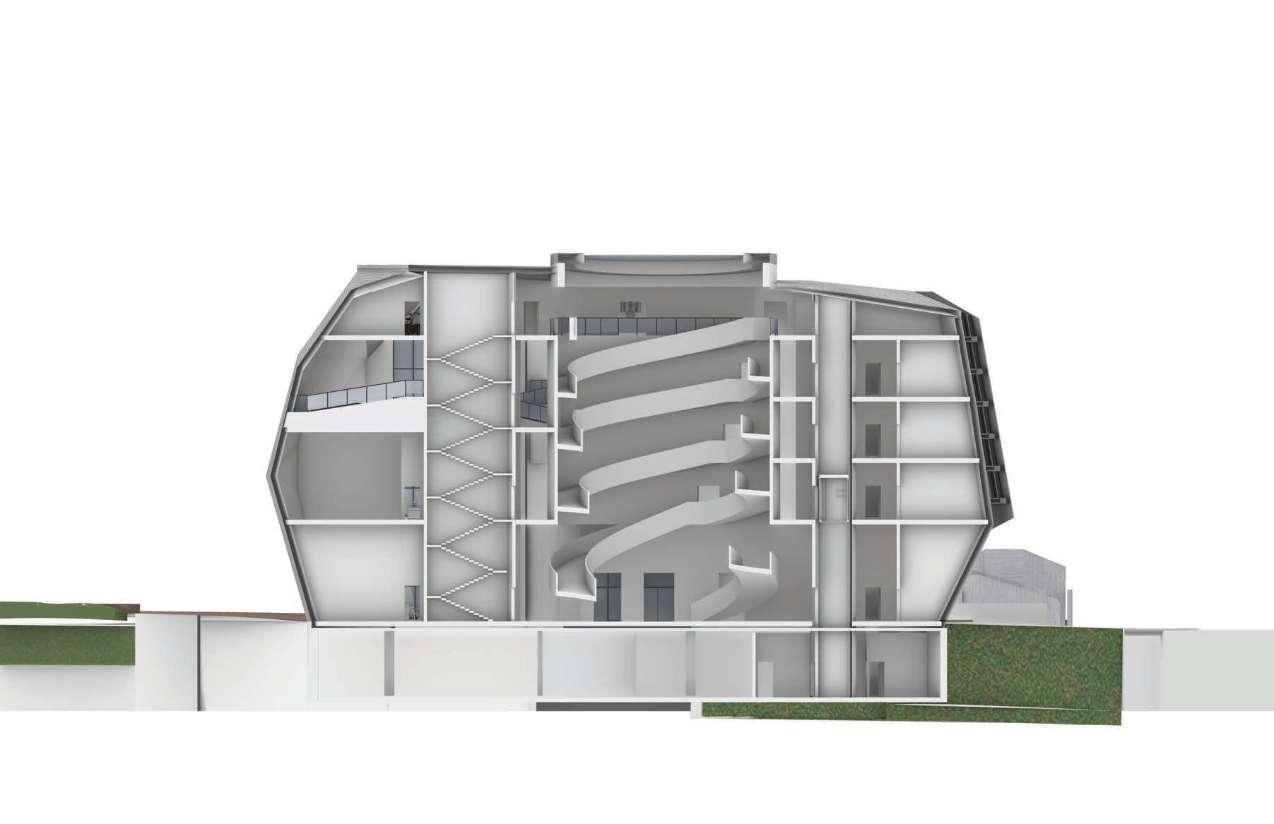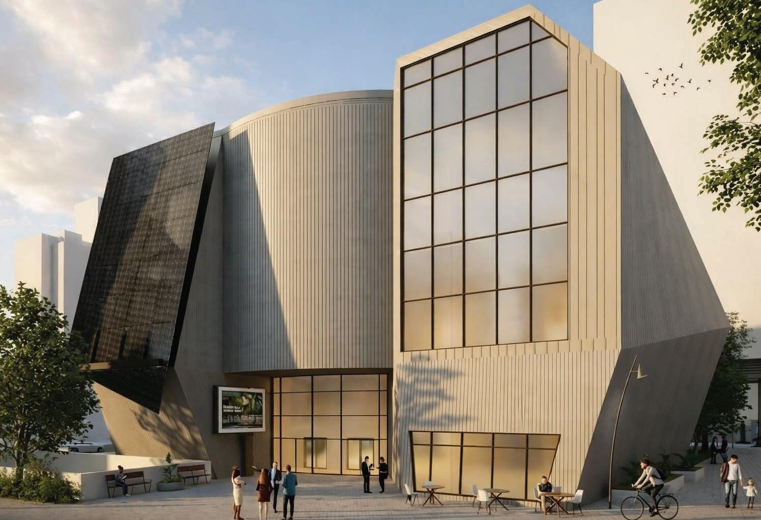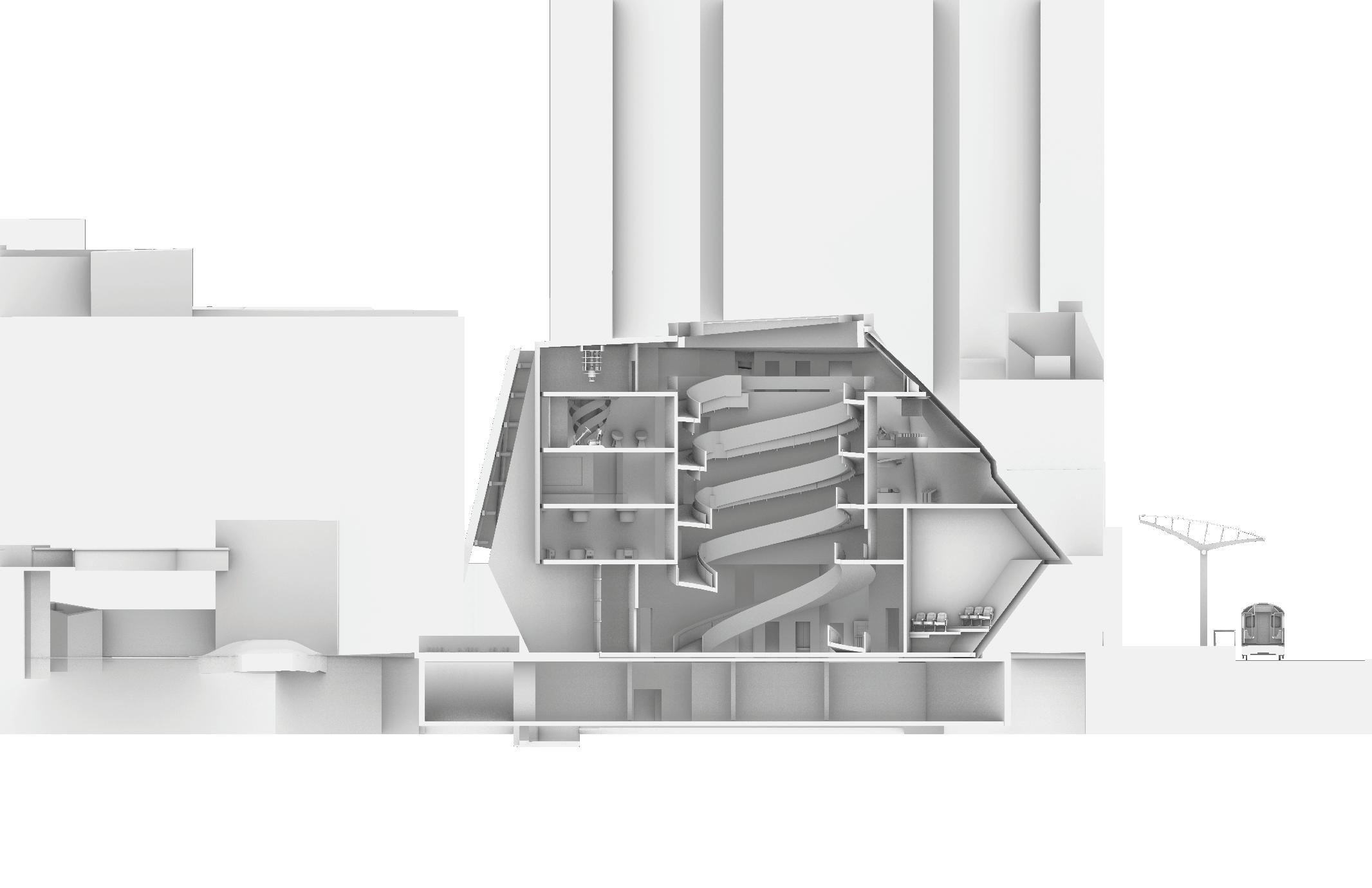 Sited in Century Gardens, the building presents itself as a singular, monolithic mass. Its material paradox is central to the concept: an unsustainable, heavy shell clad in sustainable facade systems and integrated photovoltaic panels, embodying the tension between environmental harm and responsibility that the museum interrogates.