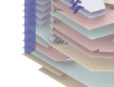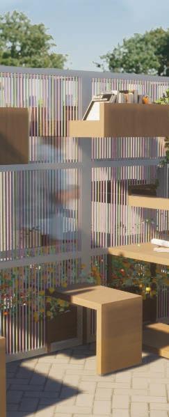 The design’s vibrant colour strips form a semi-transparent surface that maintains visual connection with the surrounding space while drawing attention and encouraging engagement. The interplay of colour and texture makes the wall a focal point, both aesthetically and socially.