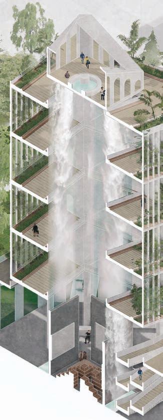 The ground floor initiates an understanding of disability and justice through a central theatre and small library. A cycle of water, symbolizing healing, begins here and threads continuously through the building.