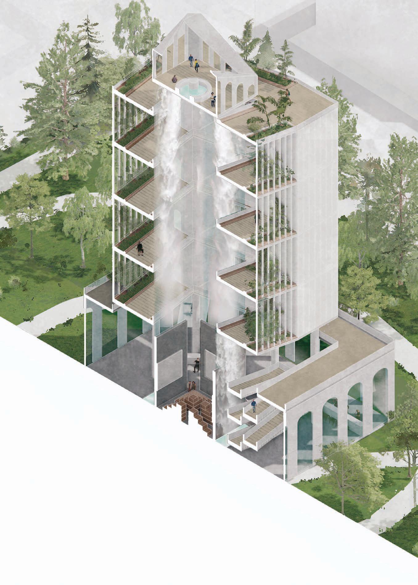 Inspired by the Tower of Babel as a metaphor for power imbalance and the turbulent, unresolved discourse around disability, the design reinterprets this narrative through architecture. The tower houses 12 rooms, each offering an immersive spatial experience of a specific disability — engaging visitors through perception, movement, and sensation. Rather than explaining disability from the outside, the tower immerses visitors directly within it to foster empathy and understanding. A continuous water feature threads through the entire building, connecting ground to rooftop as a symbol of healing and unity. Through its vertical progression, Tower of Harmony transforms architecture into an instrument of social awareness and advocacy, rewriting the story of separation into one of harmony and shared understanding.
