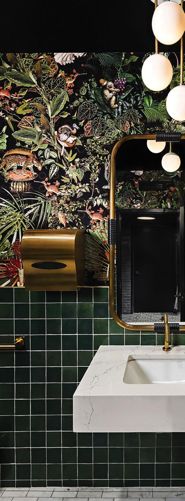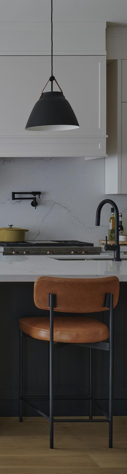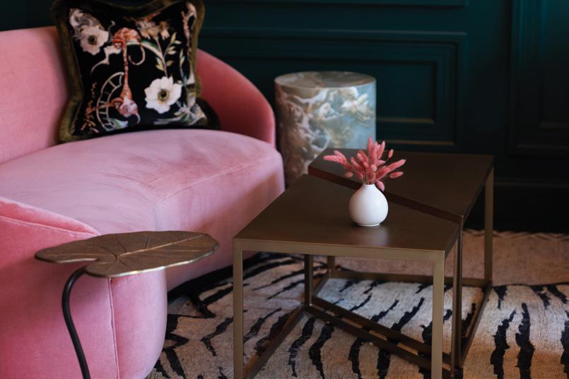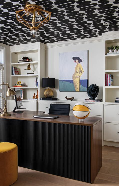 We wove biophilic design elements such as floral patterns and natural materials throughout the home. Vases filled with fresh flowers, floral chair upholstery, and tree-patterned wallpaper in the dining room bring the outside in, creating a connection with nature. The natureinspired chandelier in the dining room, with its golden branches and cascading crystal raindrops, is a homage to nature. This stunning piece adds a formal “wow” factor and ties in with the home’s overall theme of bringing nature indoors.