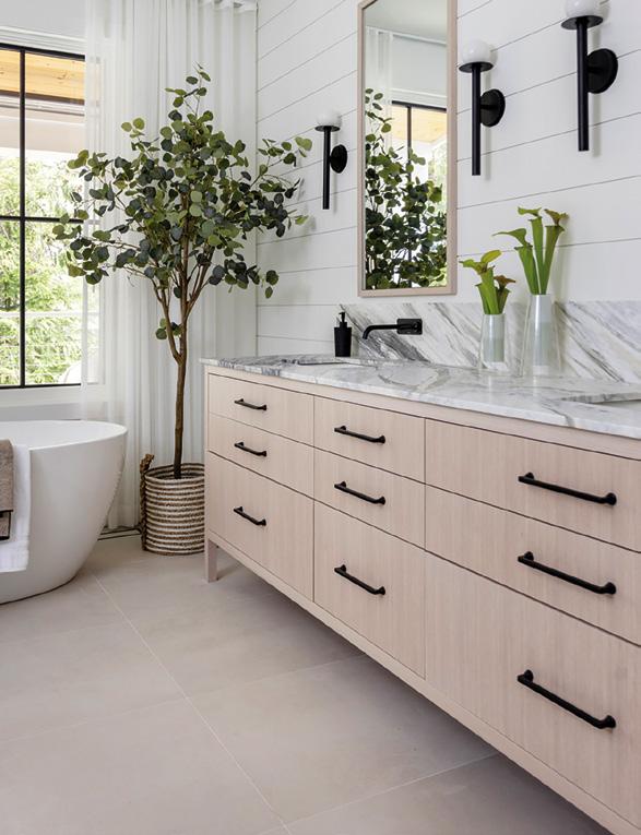 Spa-Worthy Showers and Bathtubs: Opt for state-of-theart plumbing fixtures that offer both functionality and elegance. Transform your bathroom into a personal spa with features like rain showers, steam functions, and a freestanding soaker tub. Consider touchless faucets, water-efficient fixtures, and digital shower systems that allow precise control over temperature and flow. While faucets are easy to update in the future, shower fixtures are not, so plan for the best quality your budget allows.