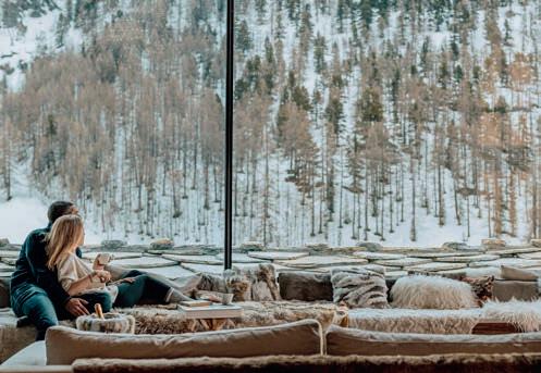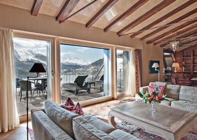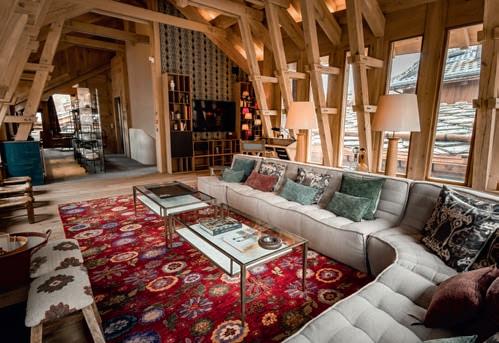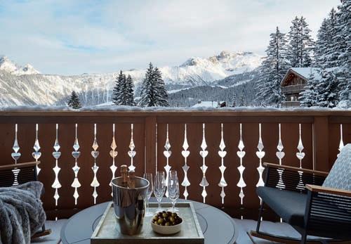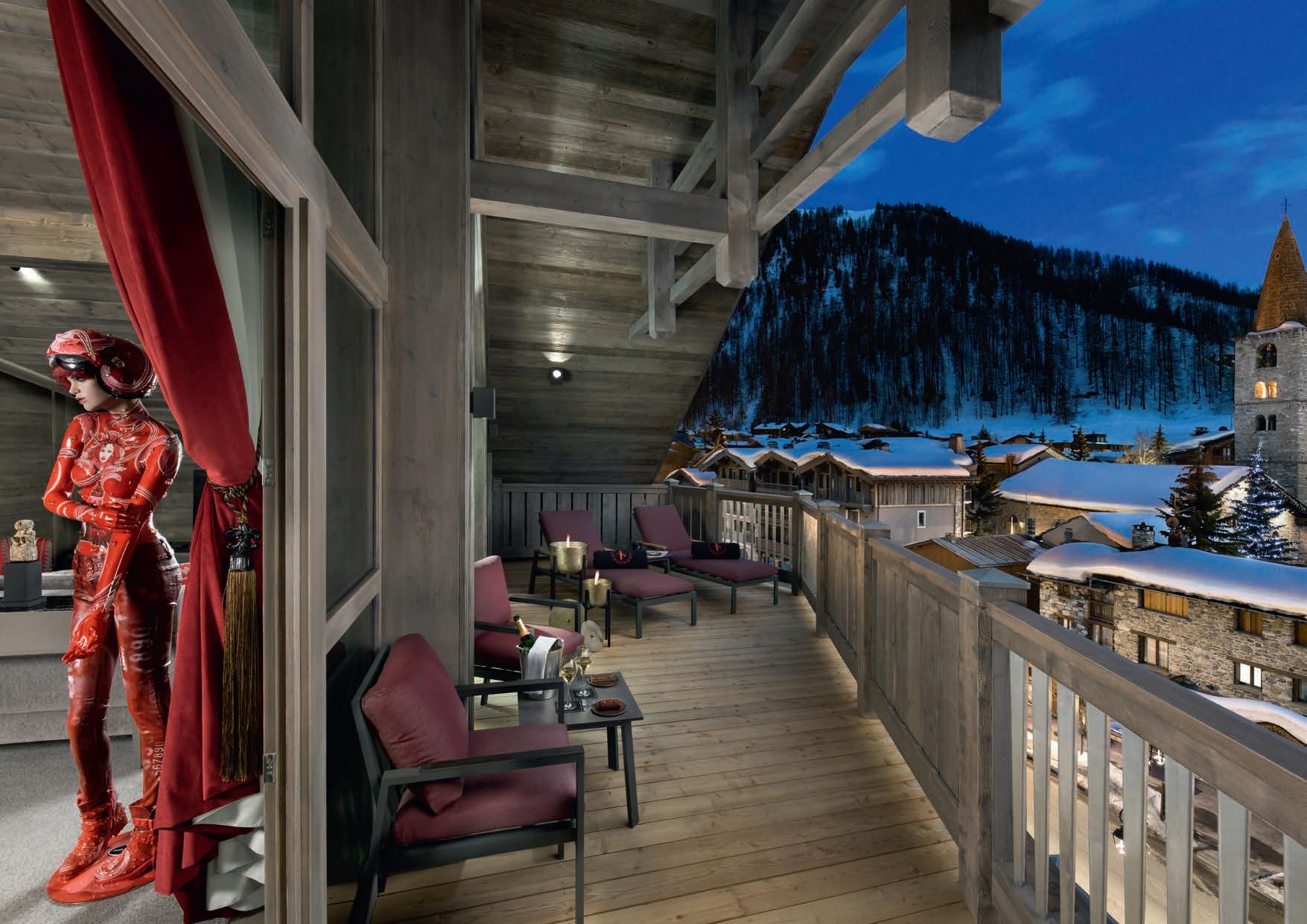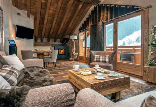 La Mourra – przytulnie urządzone wnętrza w stylu alpejskim z dominacją naturalnych elementów. Hotel ma jedynie 8 apartamentów i 5 prywatnych rezydencji w stylu „chalet”.