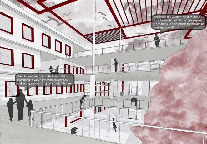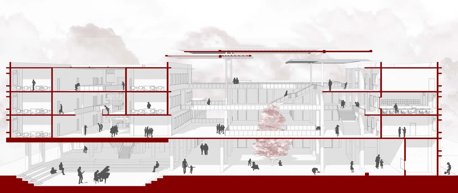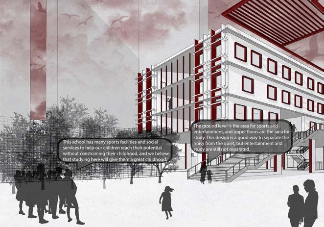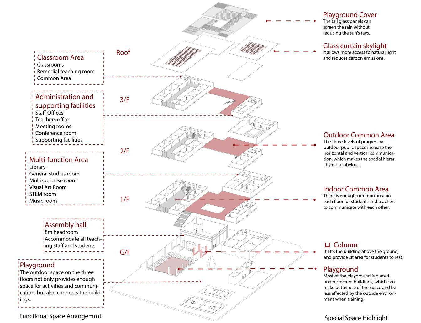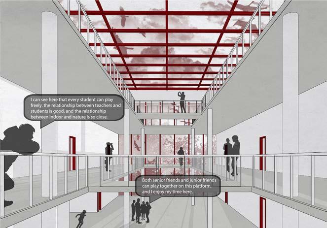In this idea, teachers and students should enjoy the resources of this school equally. The three elements - teacher, student and equipment - are interconnected and interact with each other. They share the same public space and are truly connected.