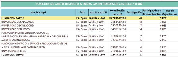 CARTIF se posiciona como el primer centro tecnológico de Castilla y León , y segundo de España, en la participación en proyectos financiados por el programa Horizon Europe de la Comisión Europea, según sus últimos datos. A su vez, CARTIF ocupa la posición número 16 a nivel nacional por detrás de prestigiosas universidades, y la número 39 si se consideran los centros tecnológicos públicos y privados de Europa. Esta realidad refleja el esfuerzo y perseverancia del centro tecnológico a lo largo de sus casi 30 años de trayectoria en su propósito por la transmisión y generación de conocimiento al tejido empresarial, tanto regional, nacional, como internacional. Todos estos pasos han conducido a CARTIF a convertirse en uno de los agentes de referencia en la investigación y la innovación aplicada, especialmente, en Castilla y León.