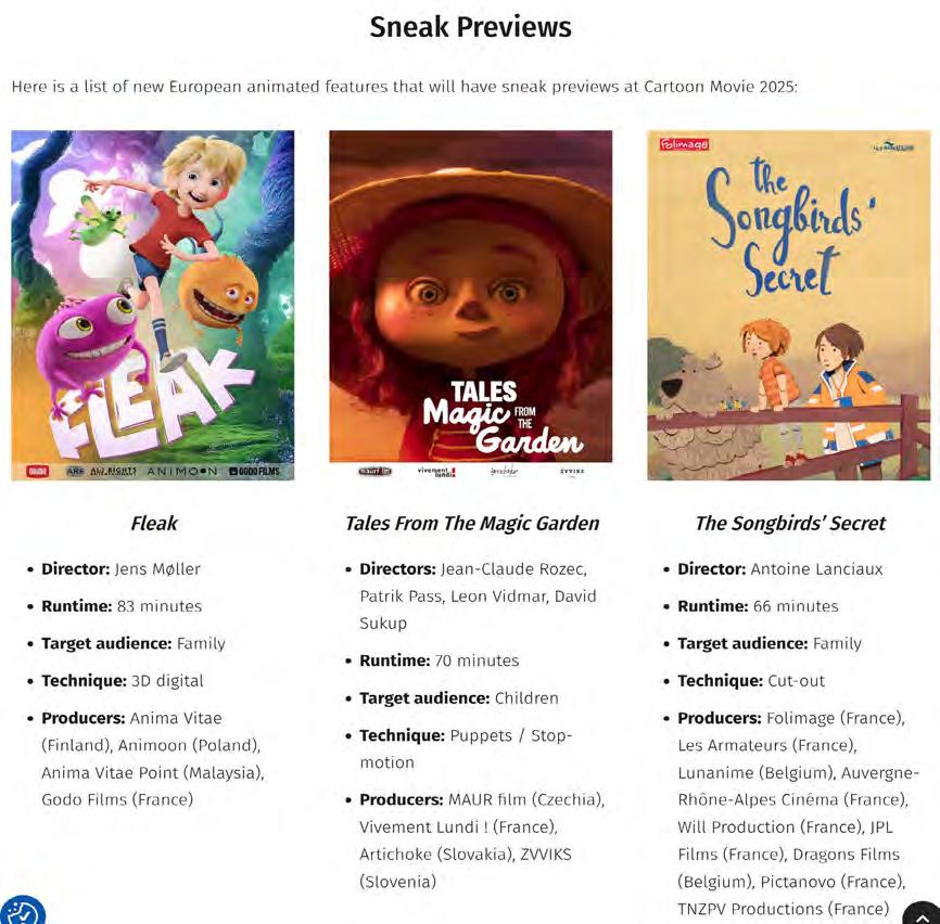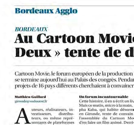 Annick Maes : Cartoon Movie est un événement dédié à la coproduction et à la présentation de longs métrages d’animation européens. Il est né en 1999 et est implanté depuis 2017 à Bordeaux, en Nouvelle Aquitaine – deuxième région française après l’Île-de-France en nombre de studios, de sociétés de production et d’écoles d’animation. Son rôle est d’accélérer le financement et la diffusion de projets longs animés, mais aussi de créer des passerelles avec d’autres secteurs tels que le jeu vidéo ou l’édition de livres. Les projets sont présentés à des agents de vente, des distributeurs, des plateformes, des investisseurs et des coproducteurs potentiels. L’une des particularités de Cartoon Movie est la possibilité de pitcher des projets à différents stades : en phase de conception, en développement, en production et en sneak preview – c'est-à-dire en montrant un extrait finalisé du film de 15 minutes. Cette dernière étape est réservée aux films qui doivent sortir en salle