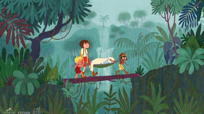 "LE BABIROUSSA" de Gabriel Hénot-Lefèvre Tchack et Araprod - concept - 2D - famille "Nous travaillons avec Araprod sur le développement de leur long métrage Maryom et Varto. Et ce sont Gorune Aprikian et Marie-Claude Arbaudie qui sont venus nous voir avec Le babiroussa, un livre de Pierre Fournier qu'il avait écrit pour son fils. Ils le connaissent bien pour avoir eu un autre projet avec lui en tant que scénariste", résume Matthieu Liégeois pour Tchack. Auteur au profil singulier, menant en parallèle une carrière de diplomate, Pierre Fournier a composé un récit initiatique, qu'il a commencé à adapter, rejoint par Mélanie Duval accompagnée de Gabriel HénotLefèvre qui réalisera le film. La direction artistique a été confiée à Jake Wu Zhonghe, Singapourien d'origine ayant fait ses études en France. "Nous souhaitions avoir une teinte un peu asiatique, et Jake nous a fait des propositions marquées par un fort parti pris, l'ambition étant de sortir des sentiers battus", expose Matthieu Liégeois. Une première au cinéma pour Tchack qui a jusqu'ici produit des films ados-adultes et plutôt engagés. Un film d'aventures dans lequel deux copains, Samuel et Jules, partent à la recherche d'un cochon magique apparu dans leurs songes, et qui pourrait sauver Jules de la maladie.