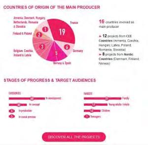 prochainement. En parallèle des sessions de pitchs, Cartoon Movie offre également des activités de networking ainsi que des masterclasses autour des grands enjeux du secteur lors de l'après-midi « Animation & Transmedia ». L’objectif est de s’adresser autant à la jeune génération de talents qu’aux cinéastes et producteurs plus aguerris. En termes de Prix, Cartoon Movie remet les Cartoon Tributes qui distinguent le réalisateur, le producteur et le distributeur (ou agent de vente) de l’année. Nous collaborons également au Prix Eurimages au développement de la coproduction pour lequel douze projets sont en lice cette année.