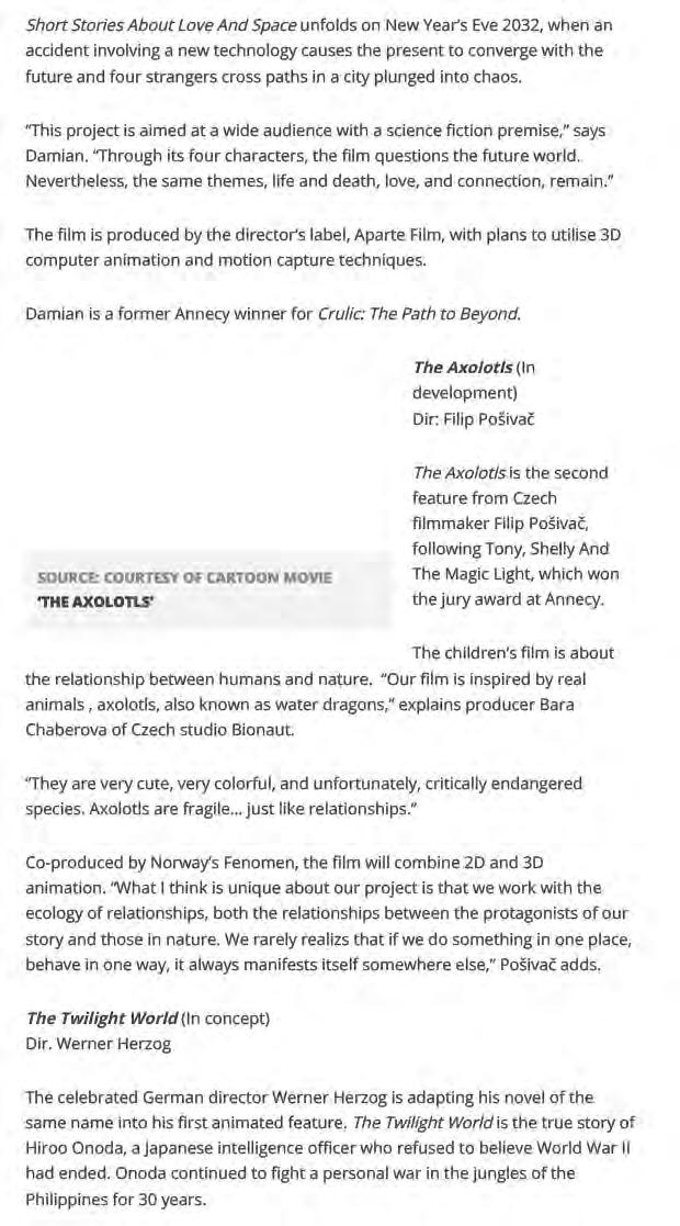 cier des renseignements japonais a continué - pendant plus de 30 ans - à livrer un combat personnel et fictif depuis la jungle des Philippines – sur le même thème Arthur Harari avait réalisé un film live. L'ambition artistique de Werner Herzog ne devrait pas manquer de convaincre les financeurs publics, agents de vente internationaux, distributeurs et diffuseurs d'embarquer dans cette aventure. “Que Werner Herzog se lance, à 82 ans, montre bien que l’animation a encore beaucoup de choses à offrir aux spectateurs”, avance Annick Maes. Qu’on se le dise, le Cartoon movie 2025 a redonné du courage et de l’énergie à toute la profession. n