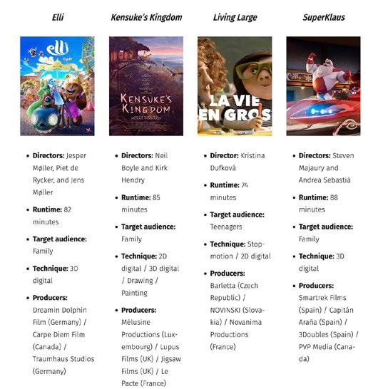 Ainsi, la majorité des longs métrages présentés sont cette année encore des films destinés à un public familial. Ils sont 31, soit 56% des propositions. Tandis que l’animation ados/adultes est un peu moins présente que l’année dernière : 10 projets contre 13. Quatre titres sont également de la partie en “sneak preview”, permettant