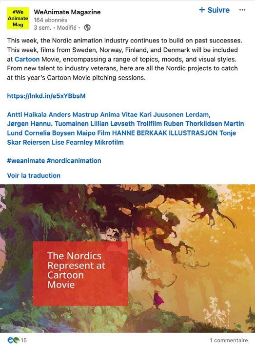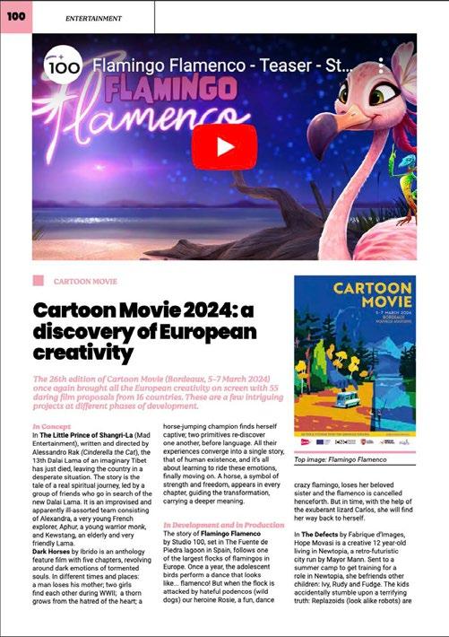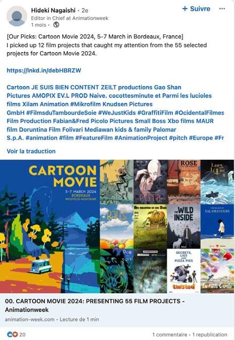 Le 21 fevrier, taus Jes participants au Cartoon Movie ont rei;:u par mail leur Guidebook, vade-mecum indispensable regroupant les contacts de !'ensemble des presents sur place et detaillant le programme des differents evenements. Un collector car ce sera le demier du genre. Lars du prochain Cartoon Forum a Toulouse, ii sera en effet transpose a la fois sur le site et !'application dediee. Cette demiere est par ailleurs en train d'etre entierement repensee, puisque sa demiere version integre Jes bandesannonces. Horrnis ces nouveautes numeriques, cette edition 2024 se deroulera selon le schema habituel, a ceci pres que le focus sur un pays sera remplace par une mise en avant des editeurs. Une importante delegation intemationale sera presente, la liste a jour au moment de notre bouclage comptant 22 representants de maisons d'edition venus de toute !'Europe, mais aussi des Etats-Unis et du Canada. En effet, Jes livres, albums illustres, romans graphiques et bandes dessinees continuent d'etre une source d'inspiration majeure pour Jes projets presentes au Cartoon Movie. Les editeurs sont d'ailleurs invites a participer a l'une des deux tables rondes, !ors de l'apres-midi Animation & transmedia qui precede l'ouverture de l'evenement. L'autre rencontre abordera le sujet de la production durable dans !'animation, afin de faire le point sur une situation europeenne encore disparate. Une nouvelle fois, !'animation frani;:aise temoigne de son dynamisme avec 15 projets presents a divers stades, dont 2 directement soutenus par la Region NouvelleAquitaine, Dans la Jaret sombre et mysterieuse de Vincent Parronaud et Alexis Ducord (Je Suis Bien Content et Gao Shan Pictures) et Picasso d Royan de Benoit Laure (Les Films du Poisson Rouge}, egalement aide par le Departement de la Charente, qui a aussi accompagne La ligne de Philippe Rolland (Eddy Cinema) La Belgique, l'Allemagne et l'Espagne suivent avec cinq projets chacun. Fait notable, Jes pays nordiques doublent leur participation par rapport a l'annee demiere avec neuf titres, qui se repartissent entre la Norvege (quatre}, le Danemark (deux}, la Suede (deux) et la Finlande (un). Directrice de Cartoon, Annick Maes y voit