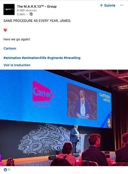 Nous portons l'idee de creer une Annee de !'animation, a !'image de l'Annee du documentaire. Cela ferait sens dans le contexte actuel au regard des differents challenges qui nous attendent au cours des mois a venir, mais aussi de tous Jes plans nationaux qui ont ete mis en place, comme France 2030. Avoir une Annee de !'animation permettrait de valoriser Jes reussites tout en preparant le futur, car nous nous situons egalement dans une periode charniere en termes de renouvellement d'accords, ne seraitce qu'avec France Televisions. Beaucoup de discussions sont a mener de front. Cela conceme aussi la fac;on de continuer a s'emparer d'outils existants tout en Jes adaptant le mieux possible aux specificites de !'animation. Je profite egalement de cette interview pour proposer la mise en place de cette Annee de !'animation.