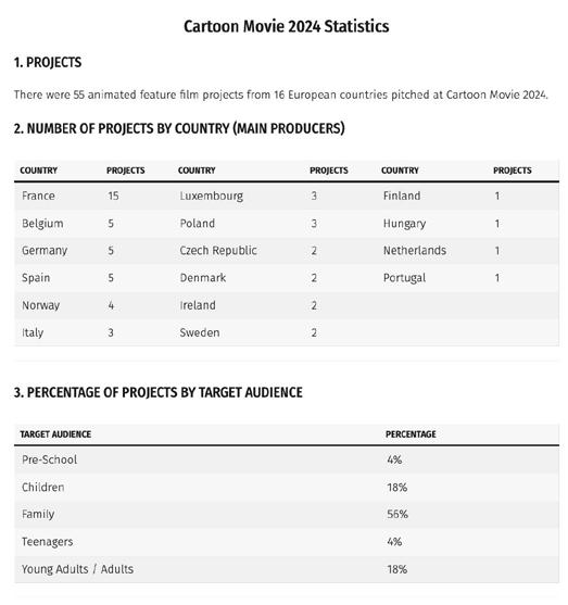 Dalla prima edizione del 1999, il Cartoon Movie (organizzato dall’Associazione europea dei film d’animazione –Cartoon, con il sostegno del programma Media- Europa creativa, dell’Unione Europea) ben 458 film animati sono stati sostenuti economicamente grazie alla rassegna con un budget totale di 3 miliardi di euro.