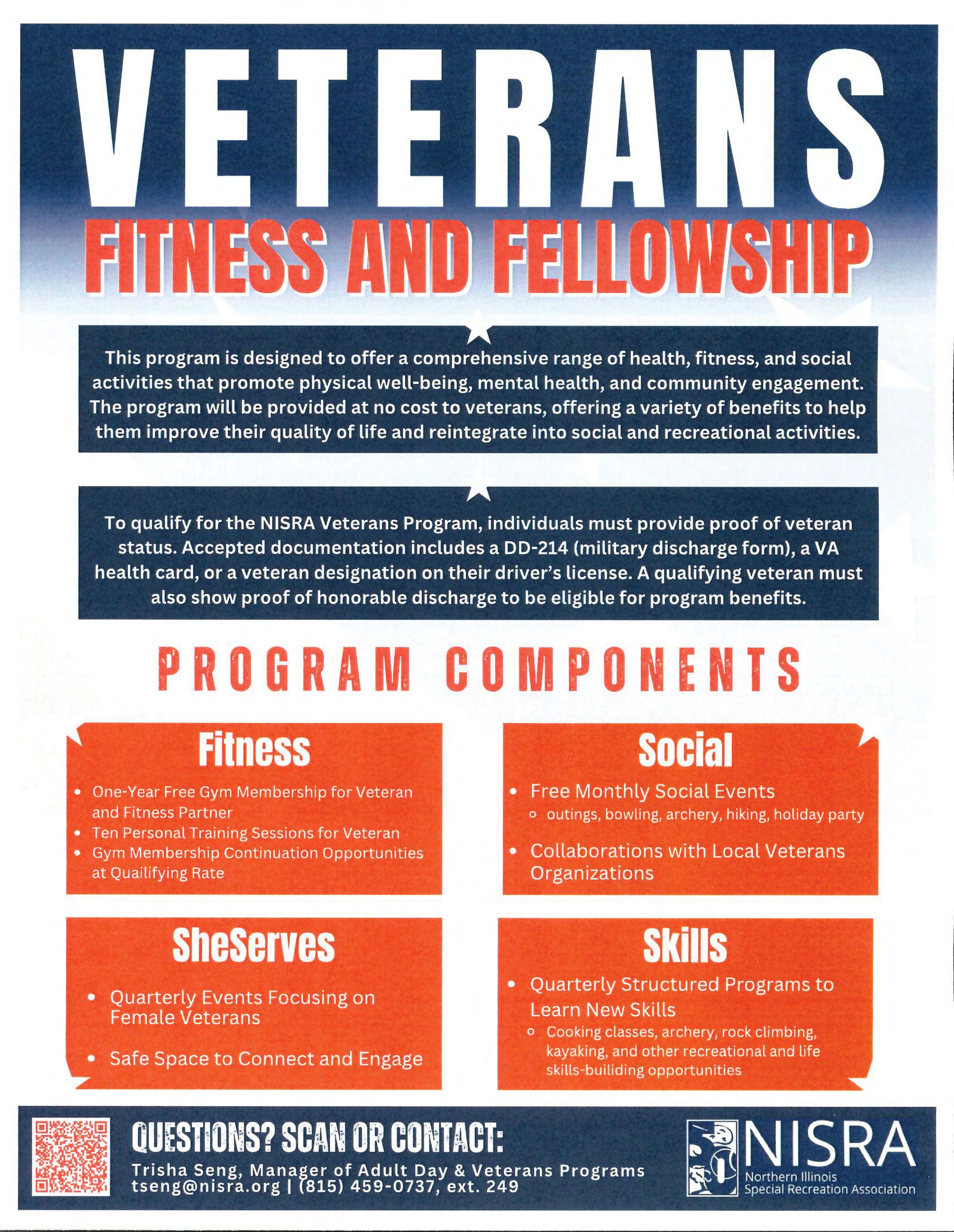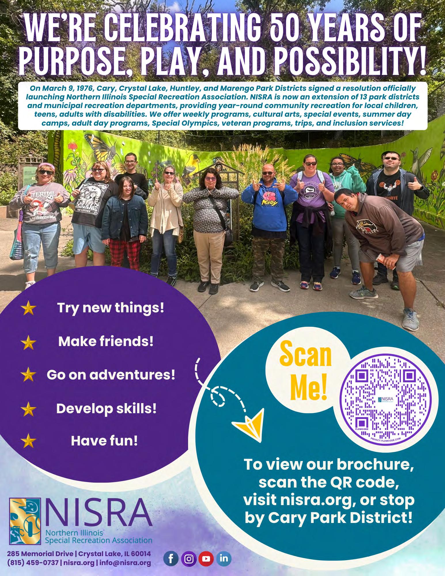 In addition to the programs listed within our brochure, the Park District also provides specialized services for people with disabilities through the Northern Illinois Special Recreation Association (NISRA). Feel free to call NISRA at 815.459.0737, or see the NISRA section of this brochure for more information.