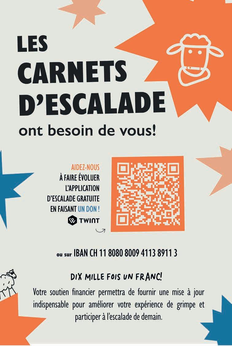 Si vous êtes touchés par cette démarche, rejoignez la communauté. Soyez respectueux en falaise, n'équipez pas à tout va, formez-vous en suivant l'une des formations disponibles sous carnetsdescalade.ch, propagez le message et contribuez à cet effort en soutenant financièrement les développements de l'application ou en sponsorisant du matériel de rééquipement. Les Carnets d'escalade et les grimpeurs vous remercient chaleureusement !
