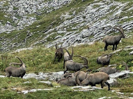 Nous entamons la dernière montée vers le Pas de l’Herbette lorsque nous voyons un, deux, trois … tout un troupeau d’une vingtaine de bouquetins qui mangent paisiblement de l’herbe et qui ne nous regardent même pas. Nous nous arrêtons également un bon moment.