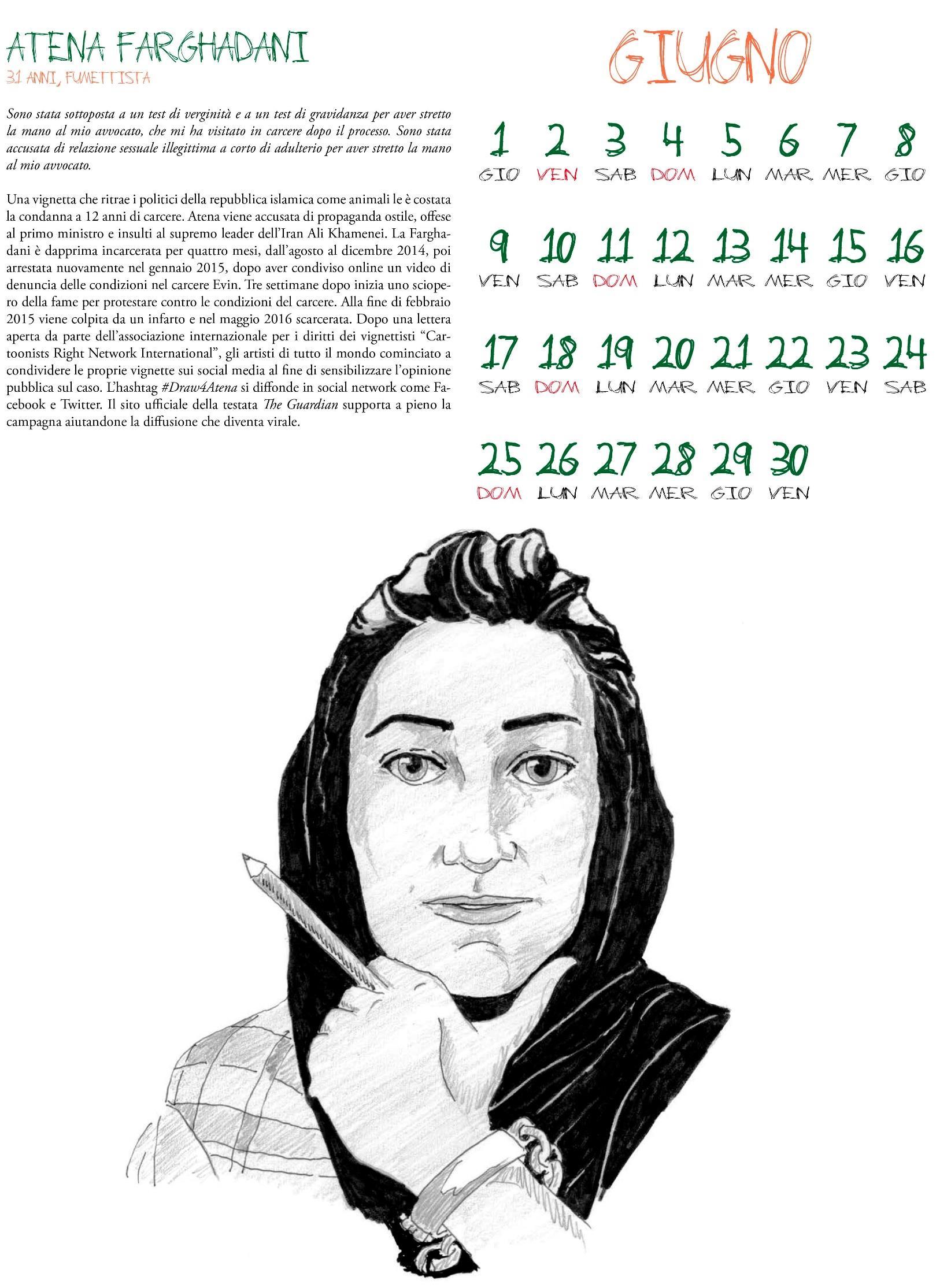 Sono trascorsi 22 anni da quando la fumettista iraniana Marjane Satrapi pubblicò il suo celebre graphic novel Persepolis, divenuto un best seller internazionale. Un capolavoro che ha contribuito non poco, attraverso un linguaggio semplice e immediato, a far conoscere al mondo i mutamenti che la Persia, oggi l’Iran degli ayatollah, ha subìto in seguito alla rivoluzione islamica, ma racconta anche dell’Europa, dell’occidente osservato dagli occhi prima di bambina, e poi di adolescente, costretta ad allontanarsi dal proprio Paese e da una dittatura opprimente, soprattutto nei confronti delle donne. Intende dunque essere un omaggio a quei disegni in bianco e nero che un giorno svelarono l’Iran al grande pubblico, questo nostro Calendario della nonviolenza 2023; crediamo anche noi nell’efficacia di una matita e nel suo carattere di “pericolosità ”. Non sono pochi infatti gli artisti in prigione in questo momento, si pensi ad Atena Farghadani, una delle protagoniste di questa pubblicazione, condannata a 12 anni di carcere per una vignetta satirica che ritrae i politici della repubblica islamica come animali. Una testimone di coraggio al mese, disegnata dall’agile matita di Tiziana Crivello che firma il suo secondo calendario a sostegno delle campagne che il MIR conduce ormai da anni, ci accompagnerà in questo cammino, solidali con il popolo persiano che sta combattendo una durissima battaglia, l’ennesima, auspichiamo la decisiva, per abbattere il regime.