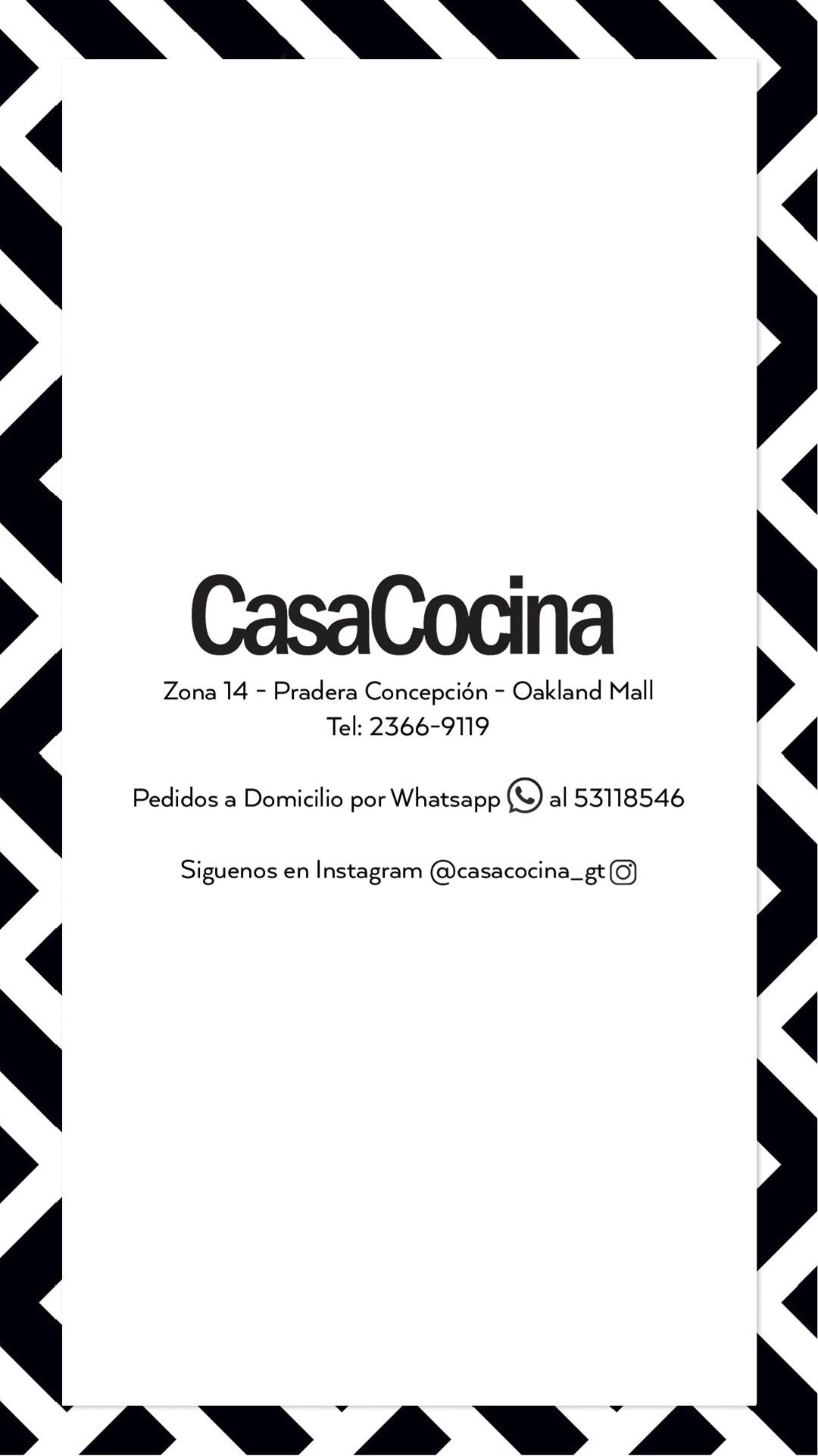 Zona 14 - Diagonal 6 - Oakland Mall Pradera Concepción - Interplaza Xela - Cayalá Tel: 2366-9119 Pedidos a domicilio por Whatsapp al 5311-8546 Síguenos en Instagram @casacocina_gt