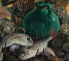 A mixed media still life artwork by Swiss-born artist Fred Kradolfer (1903-1968). Depicts a table filled with sumptuous and festive dishes such as lobsters, chicken, fish, fruits, and with liquors. With signature.
