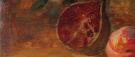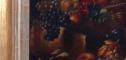 Still life painting of fruits, consisting of peaches, grapes and pomegrenates. On the right side is a pair of birds, likely a grouse, roped and hanging upside down. Circa 19th century, Europe.
