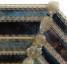 A 20th century Portuguese blue modern tapestry, with raised criss-cross lattices bearing geometric colors of red, white, gray, cyan, and deep and pale blue. Signed “”Myrthes”” at the lower left.