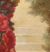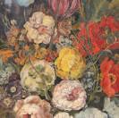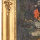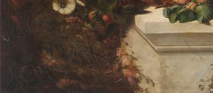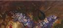 A still life painting of flowers with a colorful parrot on the side. Dated 19th century, Spain.