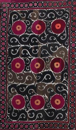 A 20th century Suzani Uzbek style carpet. “Suzani” comes from the Tadjik language meaning “sewn with a needle”. Having elegant borders and symmetrical patterns at the center.