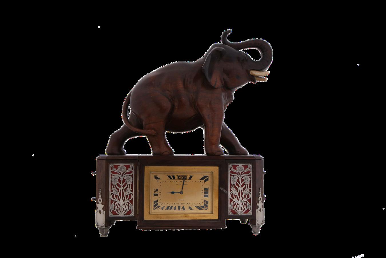 WOODEN ELEPHANT SCULPTURE ON JEWELRY BOX WITH CLOCK