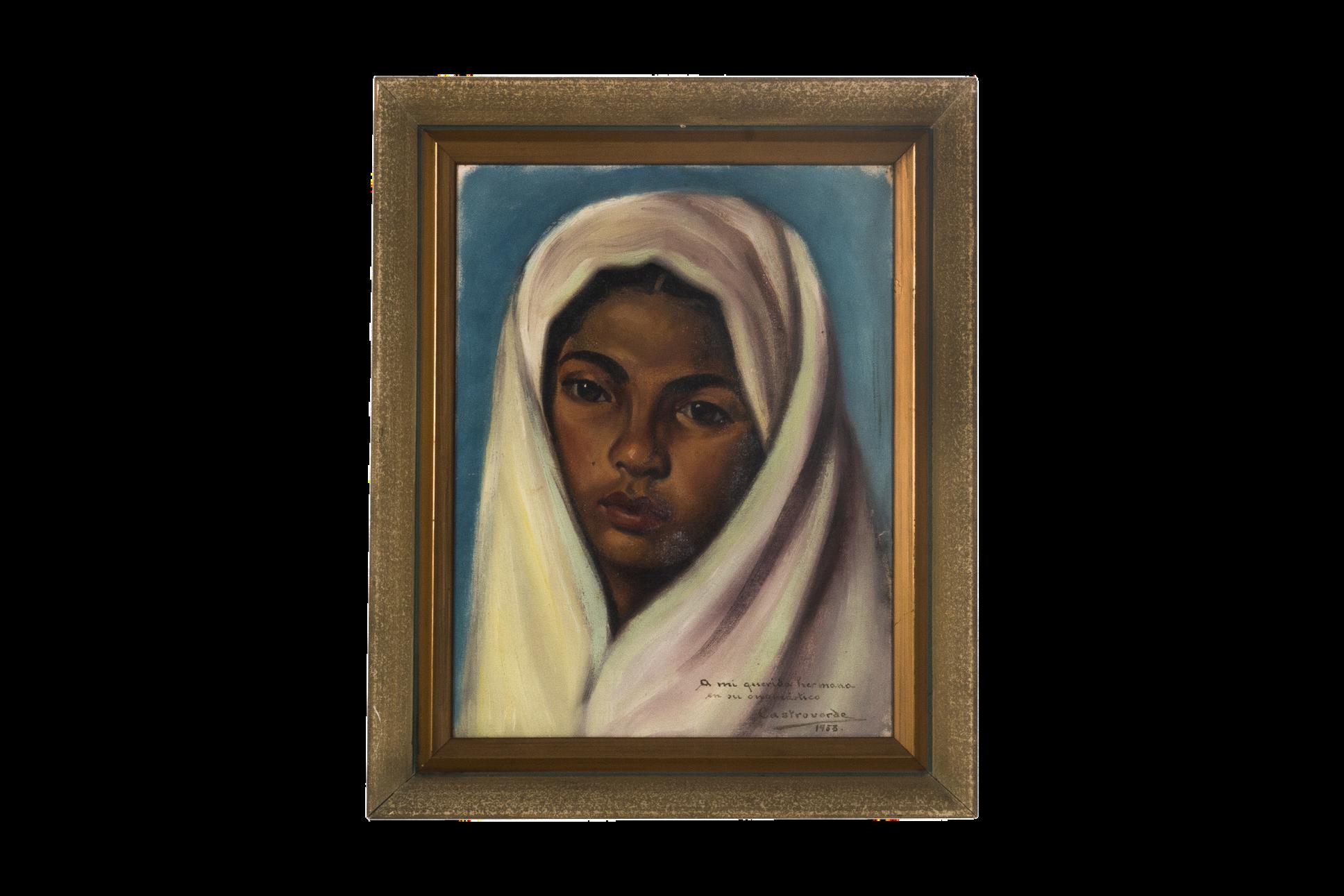 A 20th century Spanish oil on canvas portrait of a woman. With dedication "A mi querida hermana en su onomastico" (To my beloved sister on your name day) from Castroverde, municipality in Spain, and dated 1953 on lower right corner.