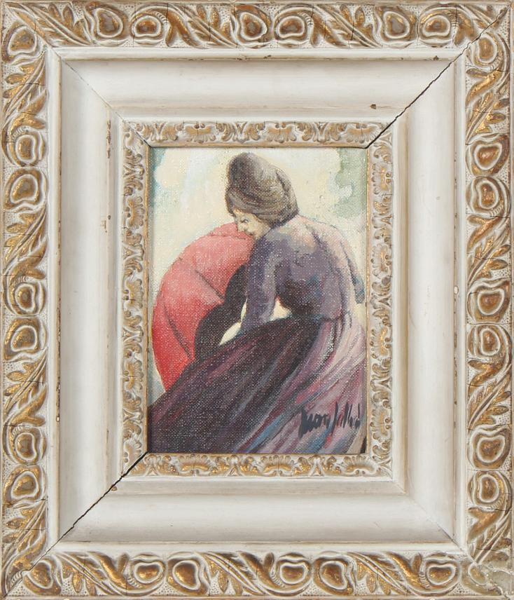 An oil on wood painting depicting a female, seemingly appearing to be a gypsy through her fashion. Dated between the Late 20th to Early 20th Century.