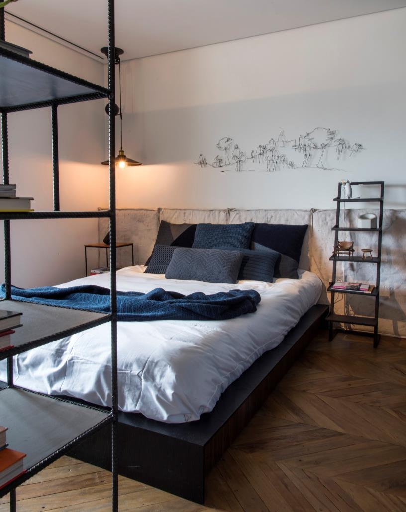 tarp at the headboard, the rebar for the bookshelf, the concrete slabs on the wall and still the gas pipes in the dining chandelier. The industrial style is present in a cozy way, exploring the contrast between the materials.