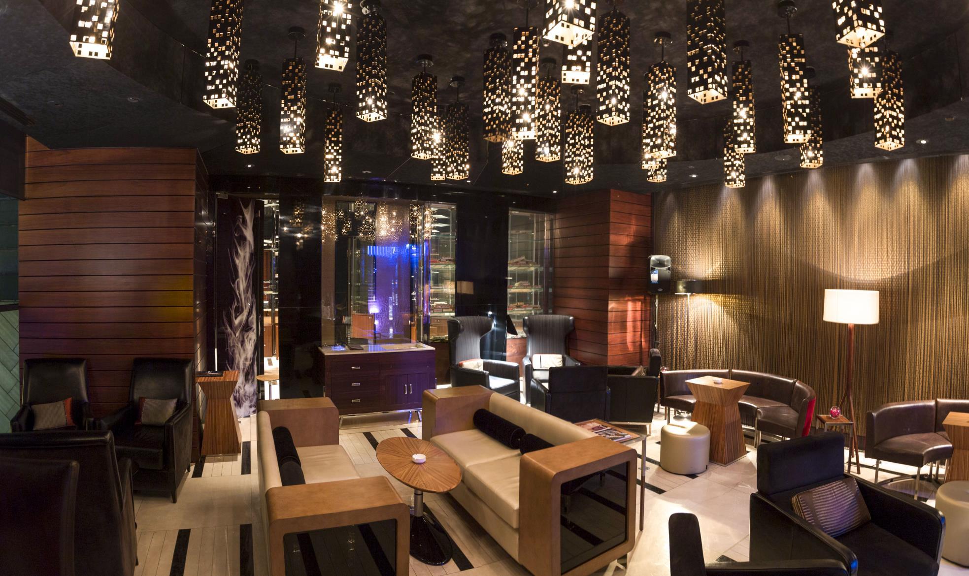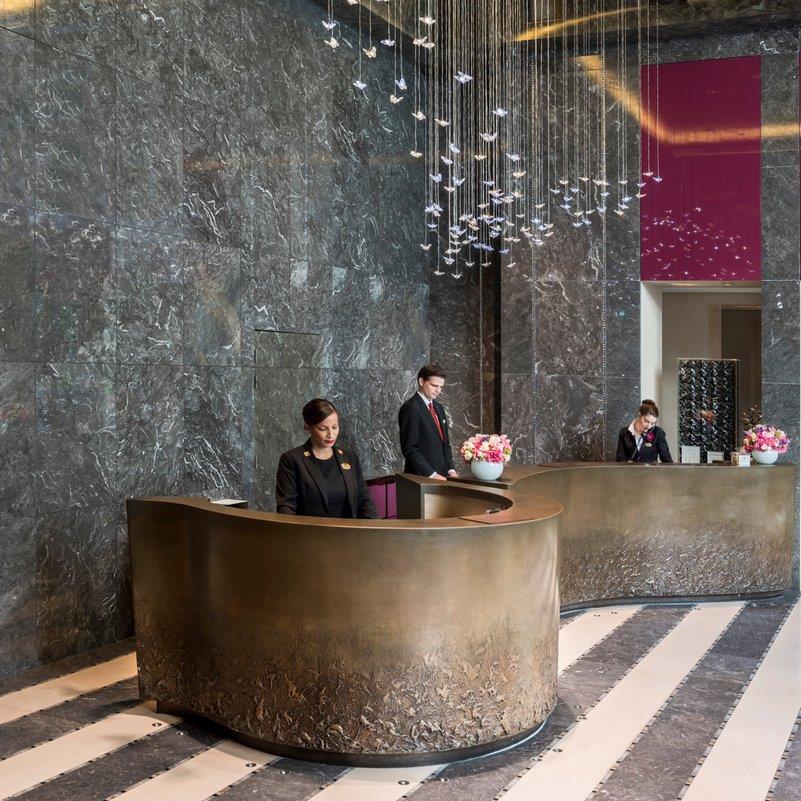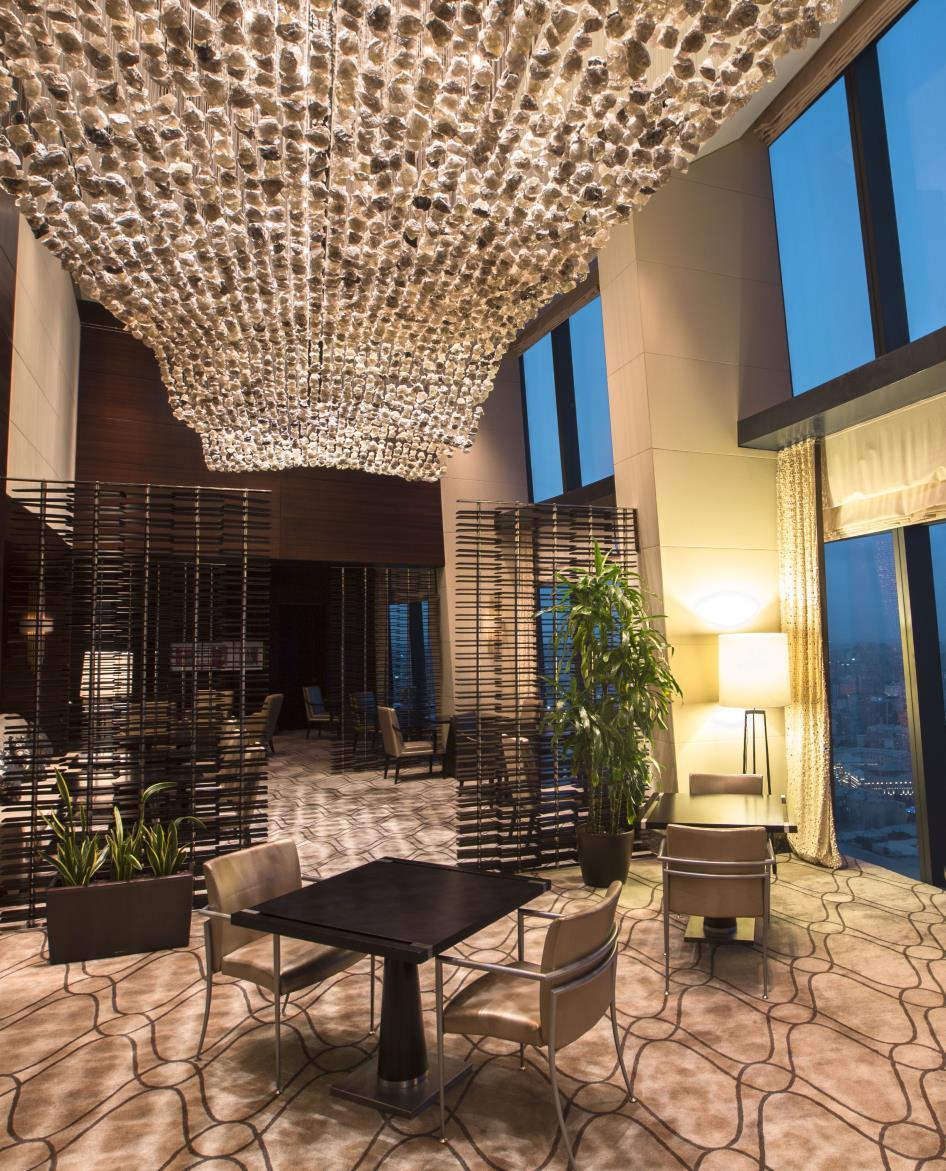 For the function and pre-function areas we selected slightly darker tones introducing deep brown materials to give a richer business vibe to the space. Patterns of the carpets represent different movements of water. Elegant red silk wall coverings in the pre-function space defines the seating areas while some red glass panels inserted in the ceiling give more interest to the meeting rooms. The shape of the lighting fixtures in the ballroom are mimicking the flame and made of bronze glass elements which are also displayed as an art installation in the main lobby, linking the public spaces to each other. The studio wanted guests to have a sense of where they were with a more holistic design. On the next level up the guest can enjoy The Jazz Club. These areas have been designed as stand alone properties by the specialised F&B division of HBA who took care of the French Brasserie as well on the main level.