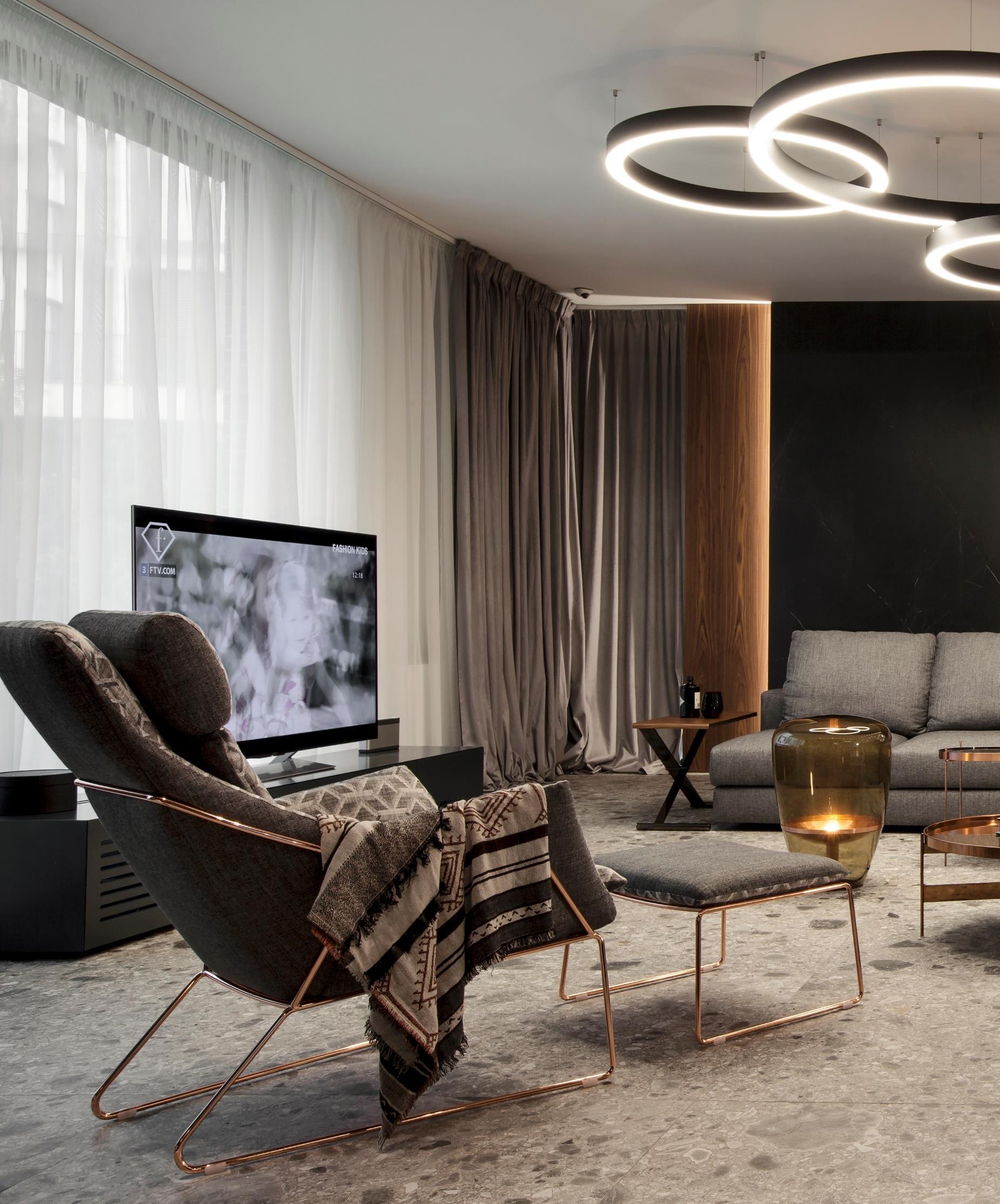 This home is a space that is categorical and elusive, coherent and creating visual stimulations all at the same time. It easily transforms, combining, yet defining the intimate and social functions of the different zones. Harmony is achieved through the calm, quiet presence of stone, wood, copper and brass. A sophisticated ether is created through the ephemeral constructionsbookshelf, that appears to be floating in the air, the bold verticals, accented by the decorative metal grid and the wood panelled walls in the master bedroom. The simplistic charm of nature - calming, warm and mysterious is blended with the modern style and trends. Discreet surrealist touch of the compositions and the explicit geometry offer beauty and constant surprise, nurturing the imagination.