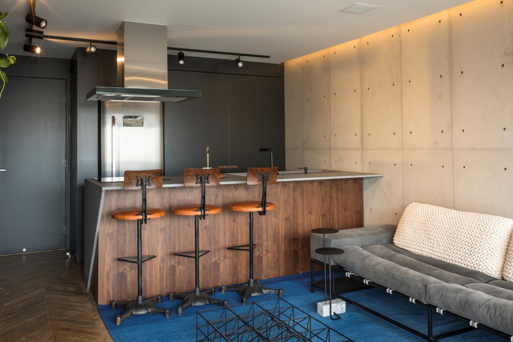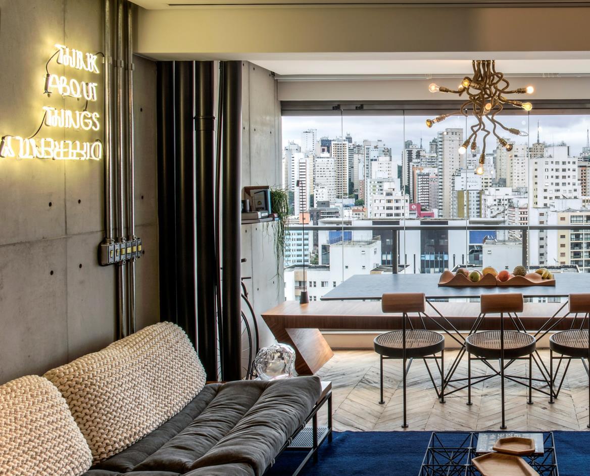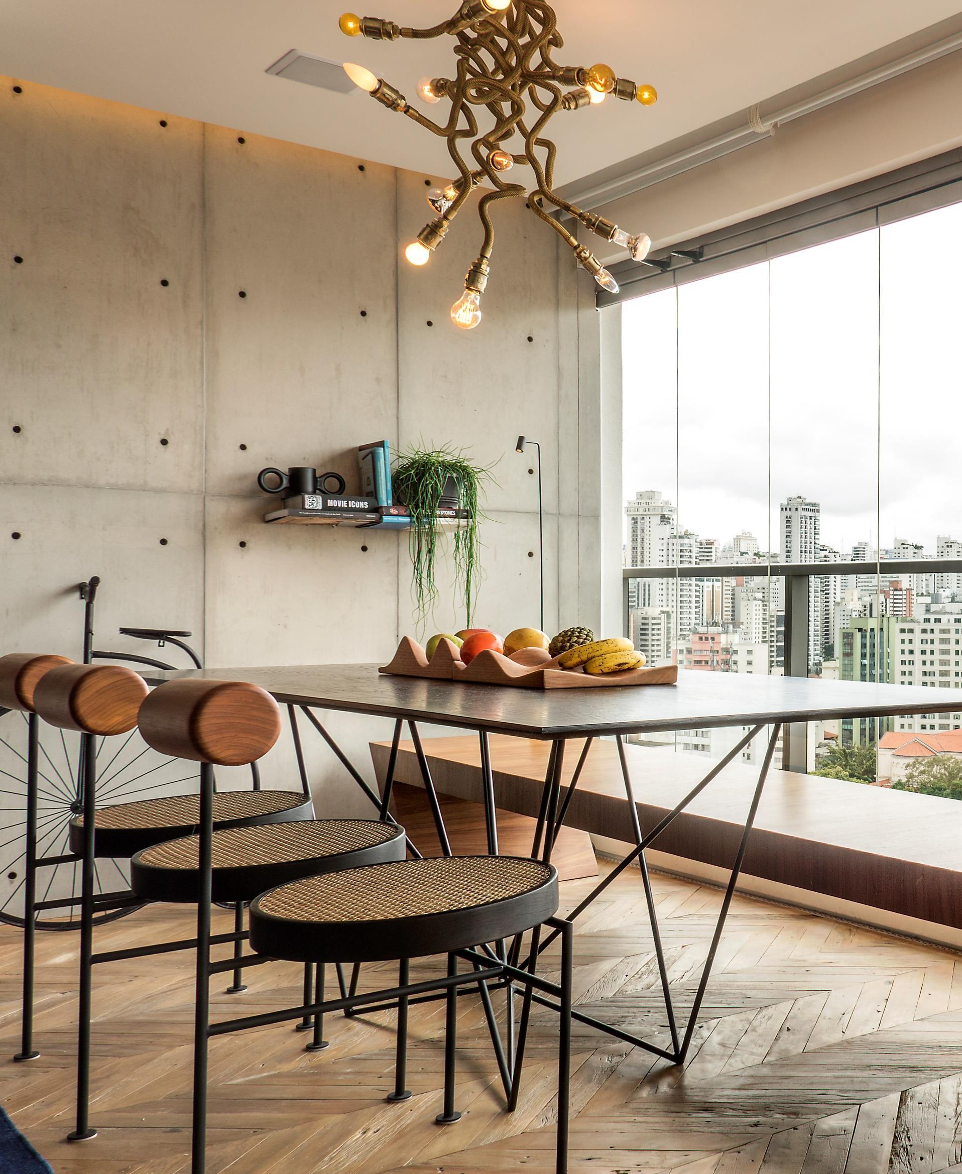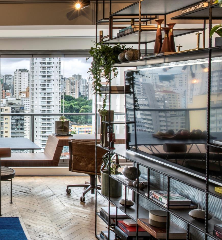 For interior design, the architects prioritized the Brazilian design, mainly by choosing the names of young talents, and also created some of the furniture. The architects created the bench that becomes a desk on the terrace, the bed, the rebar bookcase, the kitchen counter, and all the fixtures in the apartment.