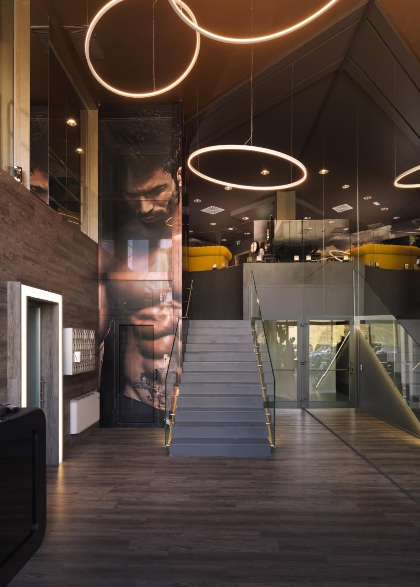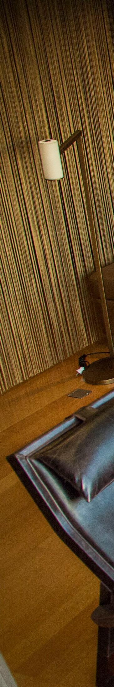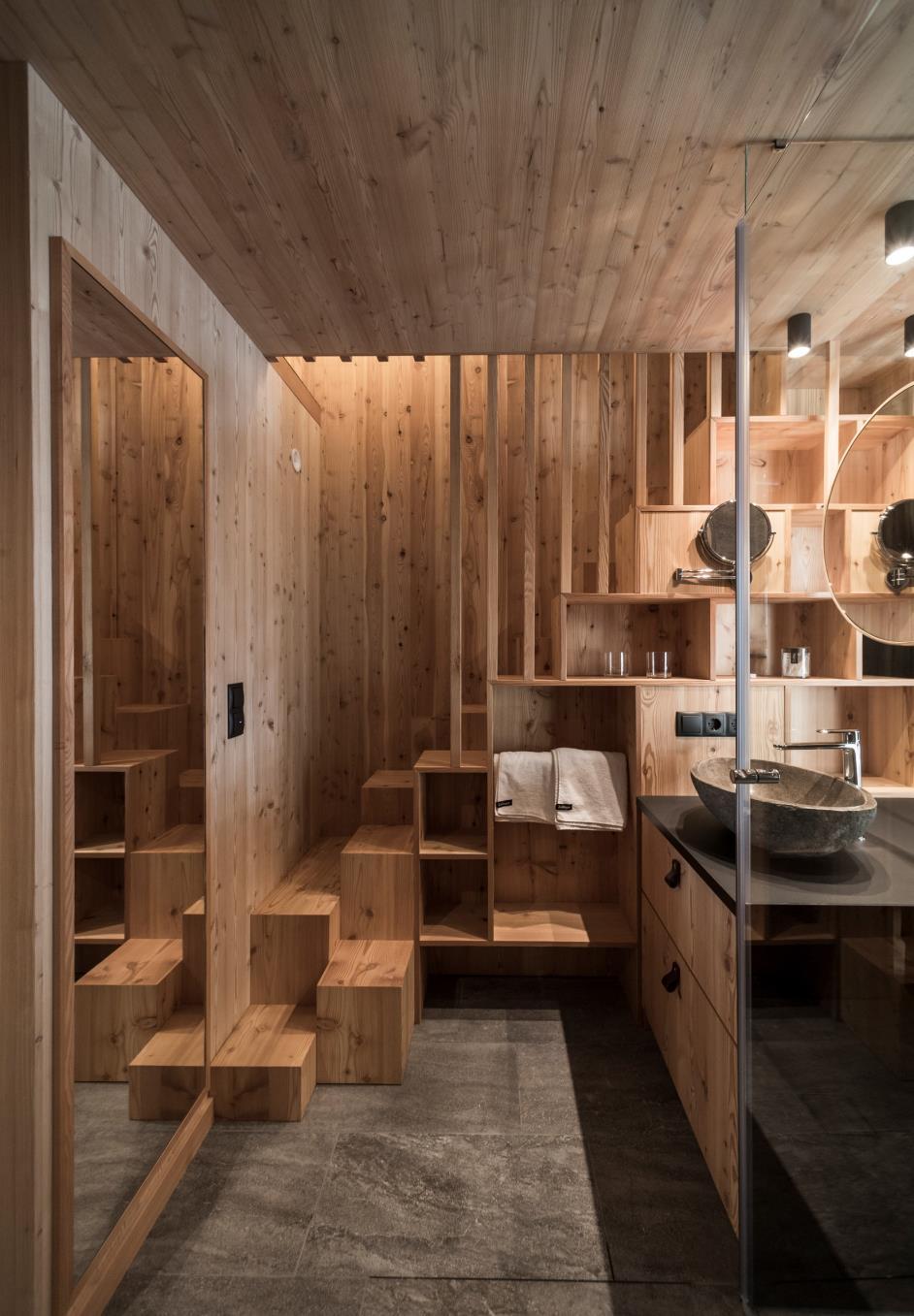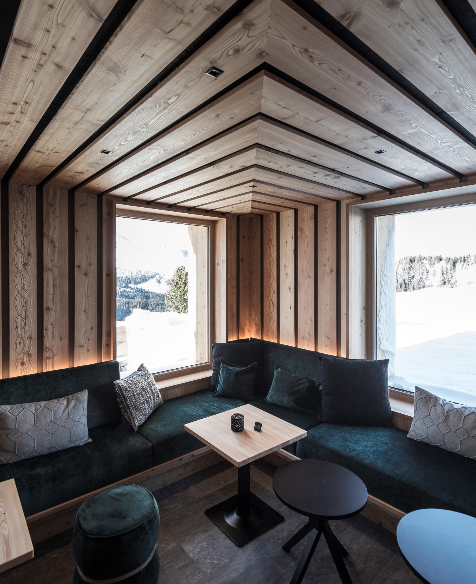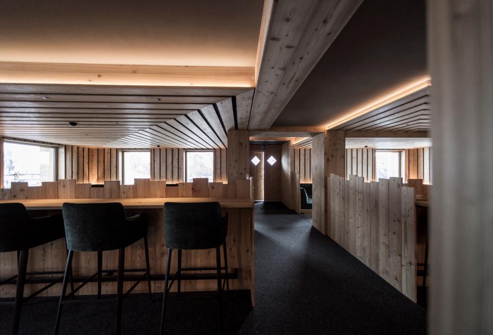 The walls are covered in wood, with the idea to recreate the atmosphere of a traditional “stube” - the classic alpine room where once the family gathered around the fireplace - but with the contemporary sign of the wooden boards that seamlessly rise from the walls and on to the ceiling, behind which, soundabsorbing panels have been positioned to create maximum acoustic comfort The choice of using a felt flooring, a traditional alpine material that combines resistance and softness, also aims to the same result